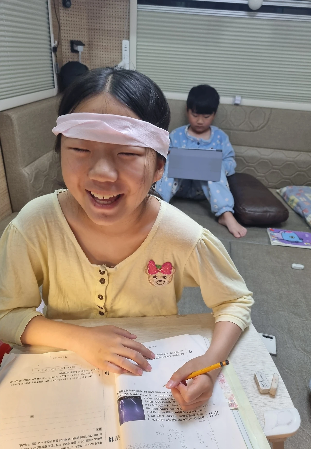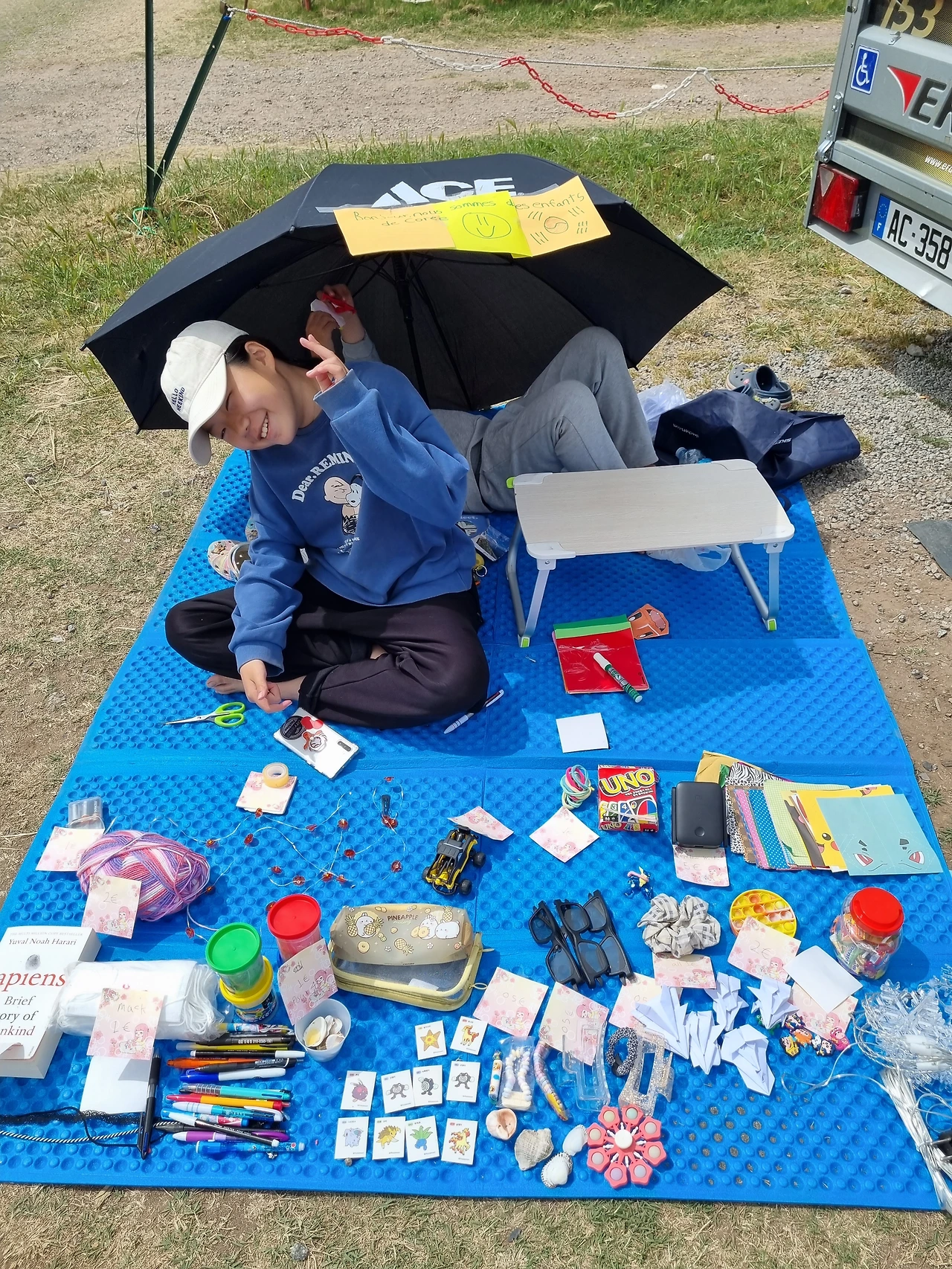 벼룩시장에 물건 팔러 나온 어린이들(누난 가격표 붙이고 판매하는 사장님 / 뚜뚜는 종이접기 노동자이나 나중엔 그러든지 말든지 냅다 누움.)