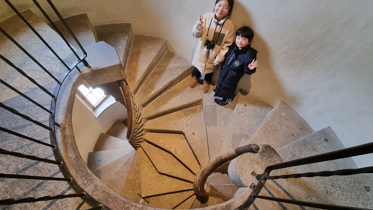 (차 견인 전 신나던 시간)한 층씩 오를때마다 만나면 뽀뽀해야하는 계단, 덕분에 김남매도 우리 부부도 애정폭발! 동생 물 먹여주는 엄마같은 누나? 문어빨판같은 특이한 지붕의 현대미술관 건물! ♡우리가족 이동경로♡