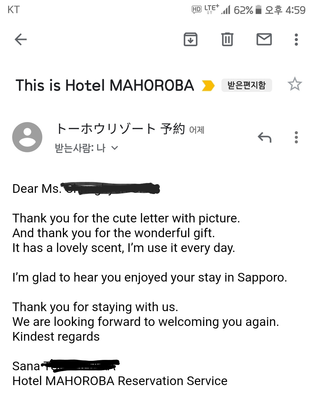 한 달 후 나는 친구와 삿포로행 비행기에 올라탔고 그 안에서 사나에게 줄 선물과 편지를 준비했다. 배은망덕하게도 한 달 사이에 고마웠던 마음이 무뎌져 버렸는지 쓸 말을 찾느라 고생했지만 어쨌든 귀여운 엽서와 사나에게 줄 핸드크림을 가지고 대망의 호텔 마호로바에 도착했다. 도착하자마자 사나를 찾아 두리번거렸지만 웬 남자 직원만이 체크인을 위해 우릴 맞아줄 뿐이었다. 체크인을 마치자마자 사나를 찾고 있다고 말하니 남자 직원은 일본인 특유의 최대한 안타까운 리액션을 취하며 사나는 이곳이 아닌 본사에서 일하는 직원이라고 말했다. 그렇게 우리는 끝끝내 사나를 만나지 못하고 선물이 전달되기를 바란채 마호로바 호텔에서의 하루를 보냈다. 다음날 일정으로 인해 마호로바 호텔을 떠나 다른 곳에서 관광을 하던 중 사나로부터 반가운 메일이 도착했다.