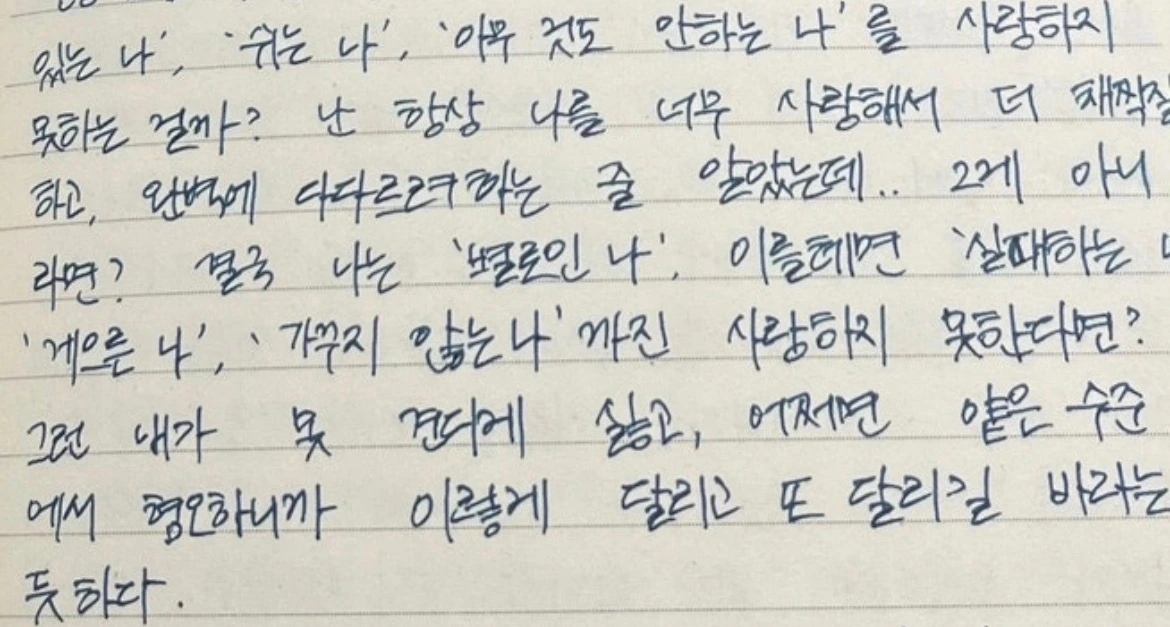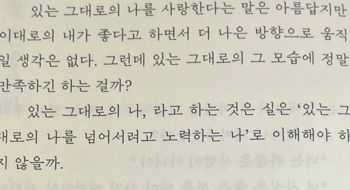 나는 발전을 포기하고 싶지 않다. 계속해서 앞으로 나아가고 싶은 사람이고, 공부를 멈추고 싶지가 않다. 성공에 대한 열망을 가지고 있는 사람이고, 뛰어나진 못하더라도 스스로를 최선을 다해 열심히 살아가는 사람이라고 생각한다. 그래서인지 있는 그대로의 나를 사랑하라는 말이, 그럼 안주하라는 말인가? 싶었다. 성과를 내지 못하고 그저 그렇게 살아가는 스스로는 사랑하지 못할 것 같았다. 나는 여타 스타트업 대표와 직원의 관계처럼, 스스로에게 대표와 직원의 역할을 부여하며 그렇게 인생에서의 성과를 평가하고, 평가당하고 있었다.