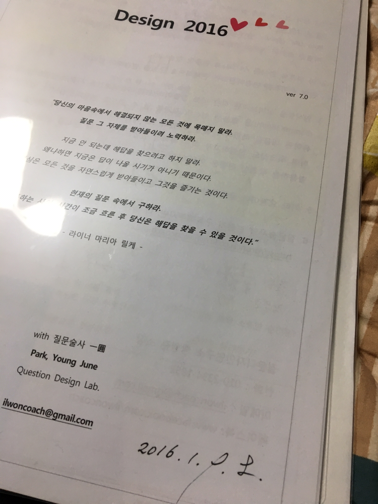질문술사 박영준 선생님이 매년(올해가 7번째 정도 된 것으로 안다. 사실여부는 확인해서 수정하는 걸로..!) 진행하시는 한 해 디자인하기 워크샵에 참여했던 자료를 꺼내 보았다. 새롭게 느껴지는 낯선 글자들이 보였다. 그걸 누가 썼느냐! 바로 나였던 것.