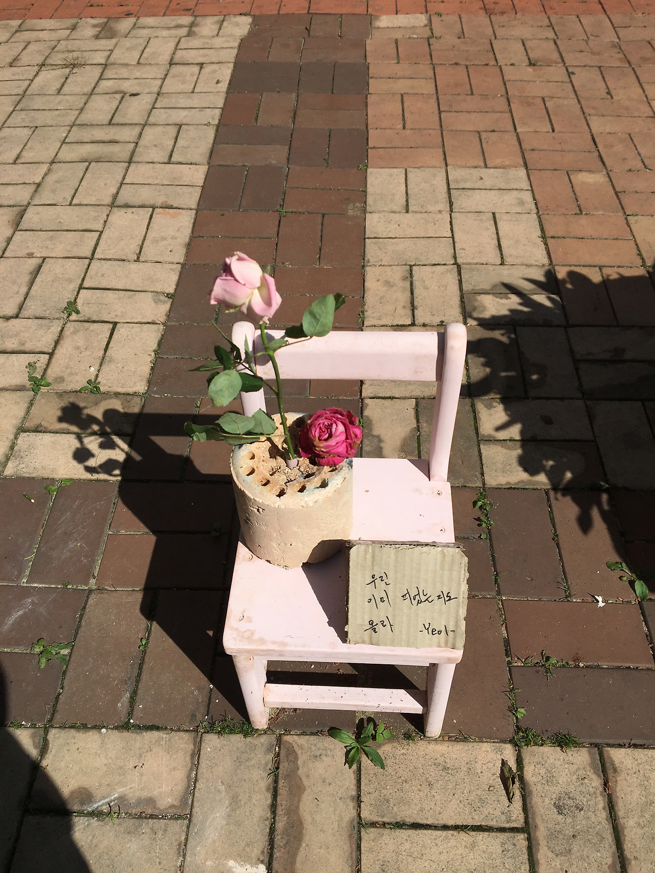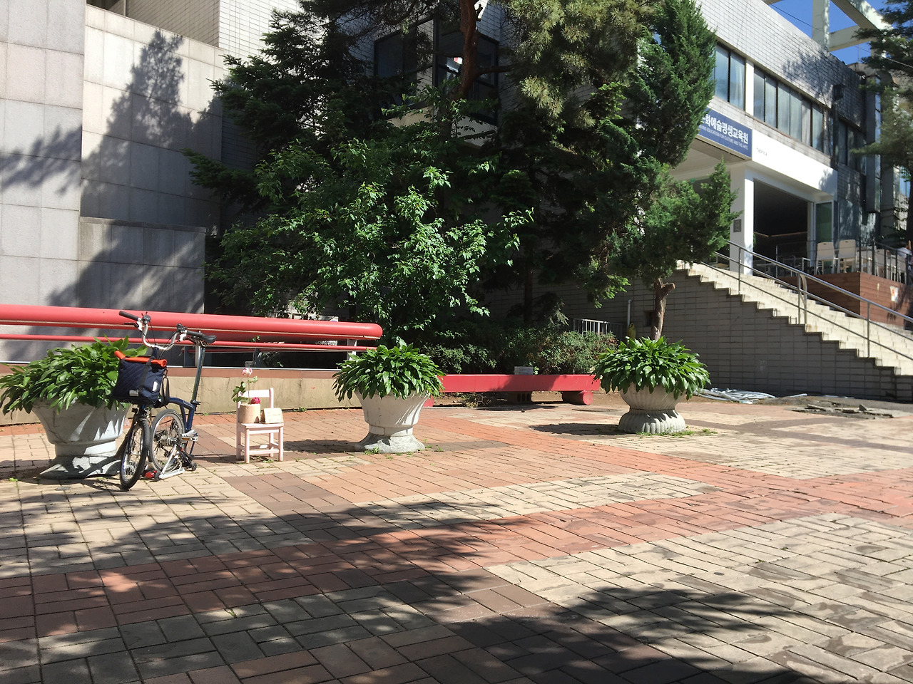 신촌에서 출발해서 경의선숲길공원을 가로질러 홍대, 상수로 내려가는 방향으로 자전거를 몰았다. 두번째 목표 장소는 숨은 그림 찾기가 필요했다. 다른 장소는 구체적인 주소지가 있는 카페 또는 매장이지만, 이번의 경우는 '홍익대학교 앞'라는 정보만 있었다. 에뛰드하우스 홍대점인가? 지도에서 검색하고 홍대앞거리에 가보았다. 평소에도 인파가 몰리는 곳이라 꺼렸었다. 자전거를 끌고 가다가 되돌아갈 수 없는 인파에 휩쓸려버렸다. 버스킹하는 뮤지션들, 댄서들, 마술사들이 촘촘히 공연을 하고 있었다. 당연히 구경하는 사람, 지나가는 사람들도 거리는 가득차 있었다. 겨우 빠져나와 글자 그대로 홍익대학교 정문 앞으로 가보기로 했다. 작가님처럼 생각해보았을 때, 홍익대학교 정문 앞에 설치하셨을 거 같았다. 혹시나 해서 먼저 들렸던 그 거리는 역시나 아니었다. 정문 앞엔 없고, 멀리 넓게 둘러보자 눈에 들어왔다. 정문의 오른쪽 편 화단 사이에 설치되어 있었다. 대학원 건물입구 근처였다. 북적이고 시끌벅적 했던 곳과는 다르게 이 곳은 주말이라 오히려 한산했다.