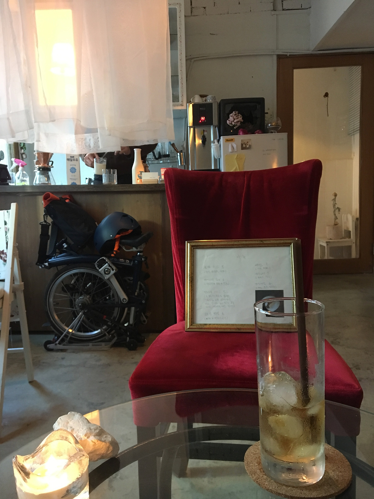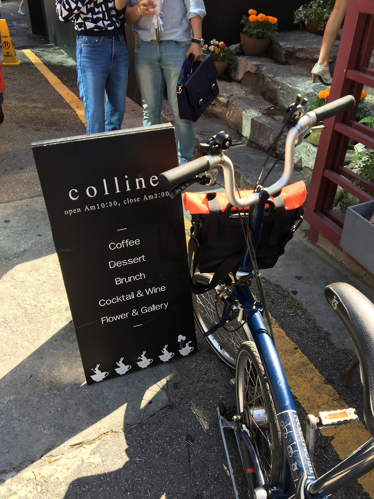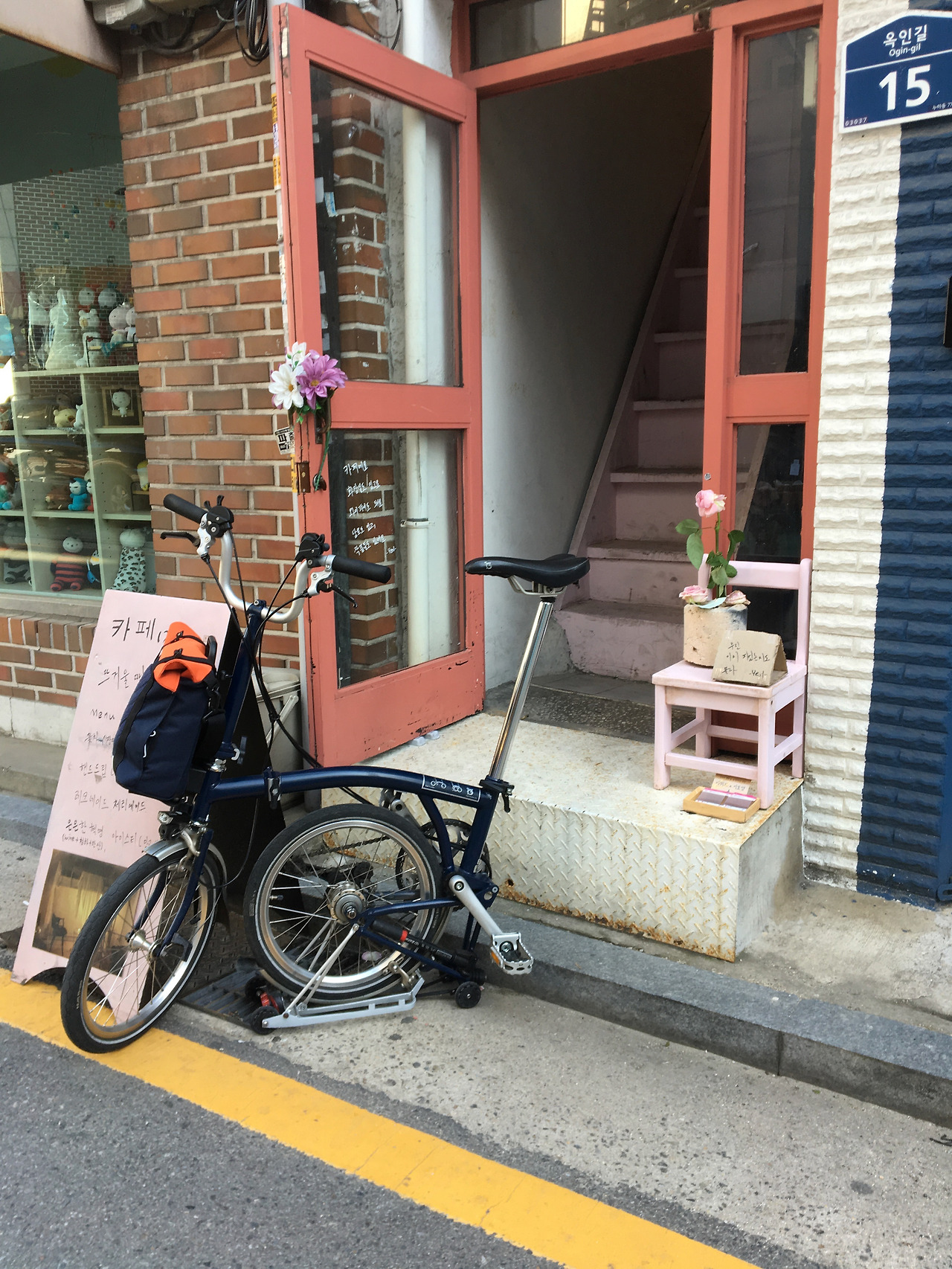 서촌 옥인길 누하동 77-7번지 2층, 주소까지 감성적인 공간 '뜨거울 때 꽃이 핀다' 갤러리 카페에 도착했다. 약 2시간여 정도 바쁘게 움직였다. 올해 들어서 가장 무더운 날이었던 것 같다. 강렬한 햇살과 아직은 시원한 바람이 대조를 이루는 라이딩은 참 상쾌했다. 손님들이 나가신 후 잠시동안 텀이 생겨 이런저런 이야기를 나누며 한숨 돌리고 다시 손님을 채워질 무렵 브롬튼을 손에 들었다.