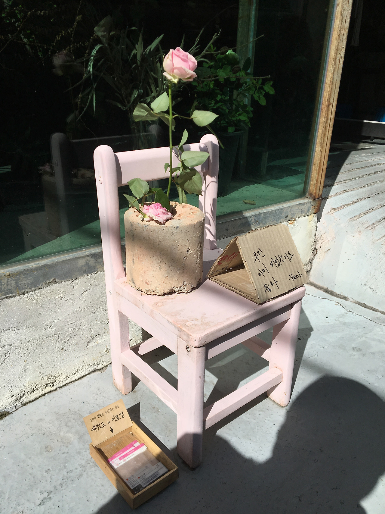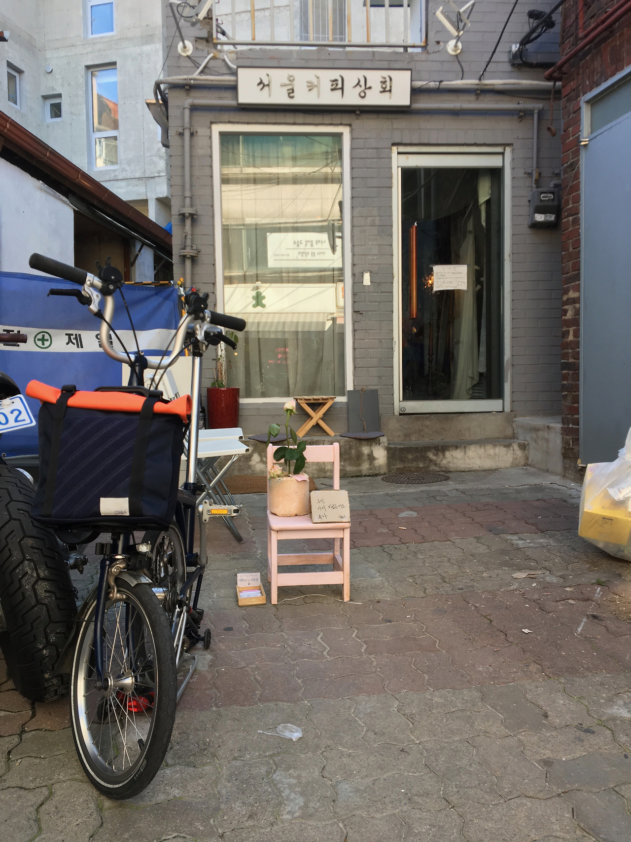 왔던 길을 되돌아서 시원하게 달렸다. 광화문 앞거리에 설치된 자전거전용도로는 삼청동으로 올 때는 역방향이라 이용할 수 없지만 서촌으로 갈 때는 정방향으로 이용가능해서 움직이기 훨씬 수월했다. 경복궁 서쪽 담을 따라 올라가다가 통인시장 옆 골목에 위치한 카페 서울커피상회 앞에 멈춰섰다. 이 매장이 서촌에 오픈할 때 이효열 작가님의 특별전시가 열렸었다. 그 이후로 매장 입구 마당에 여전히 작품이 설치되어 있었다. 그 위치에 이번 작품이 설치되어 있었다.