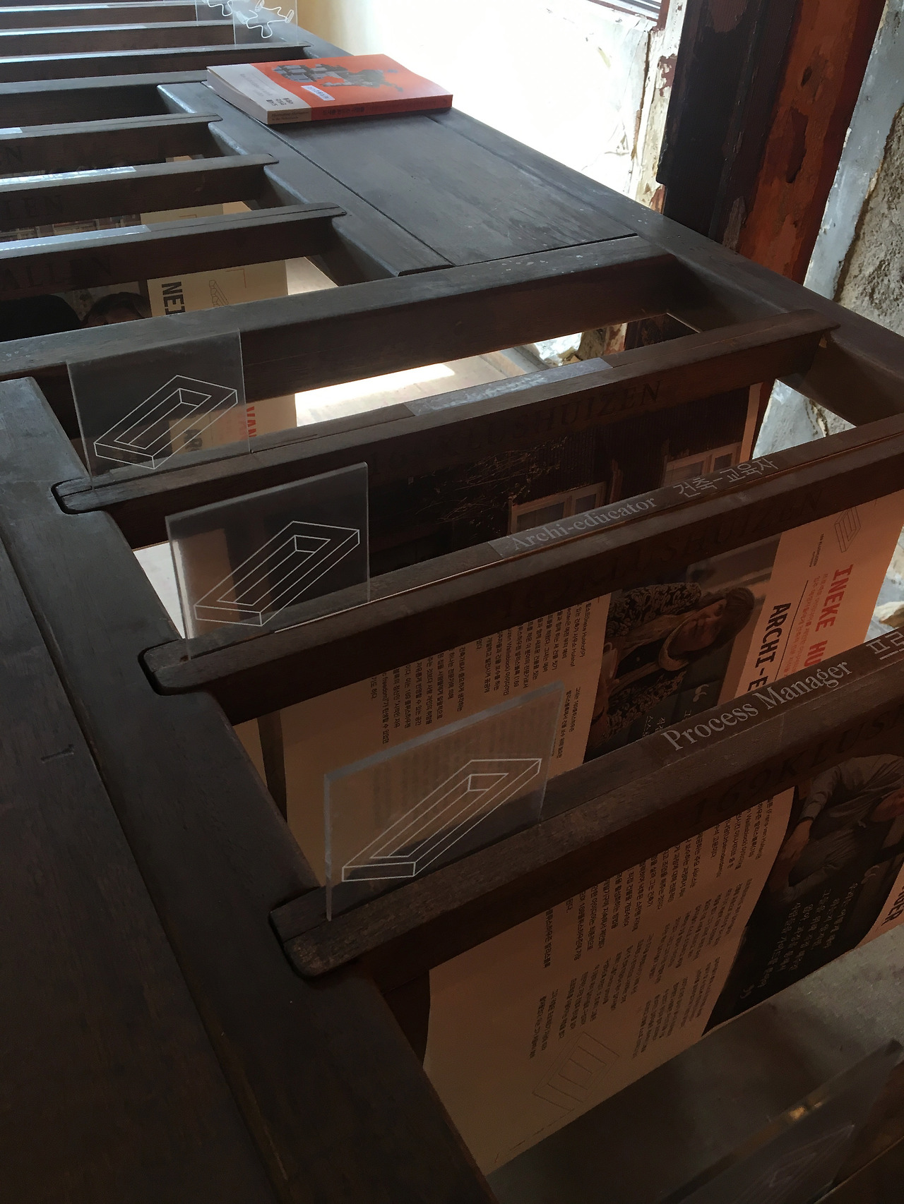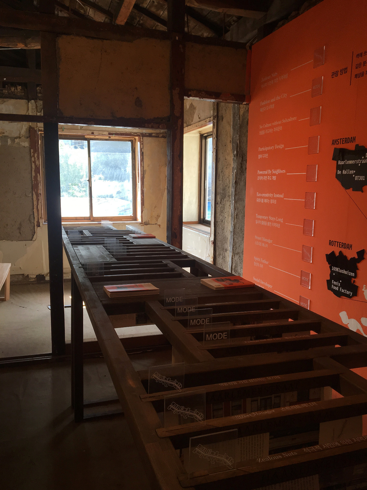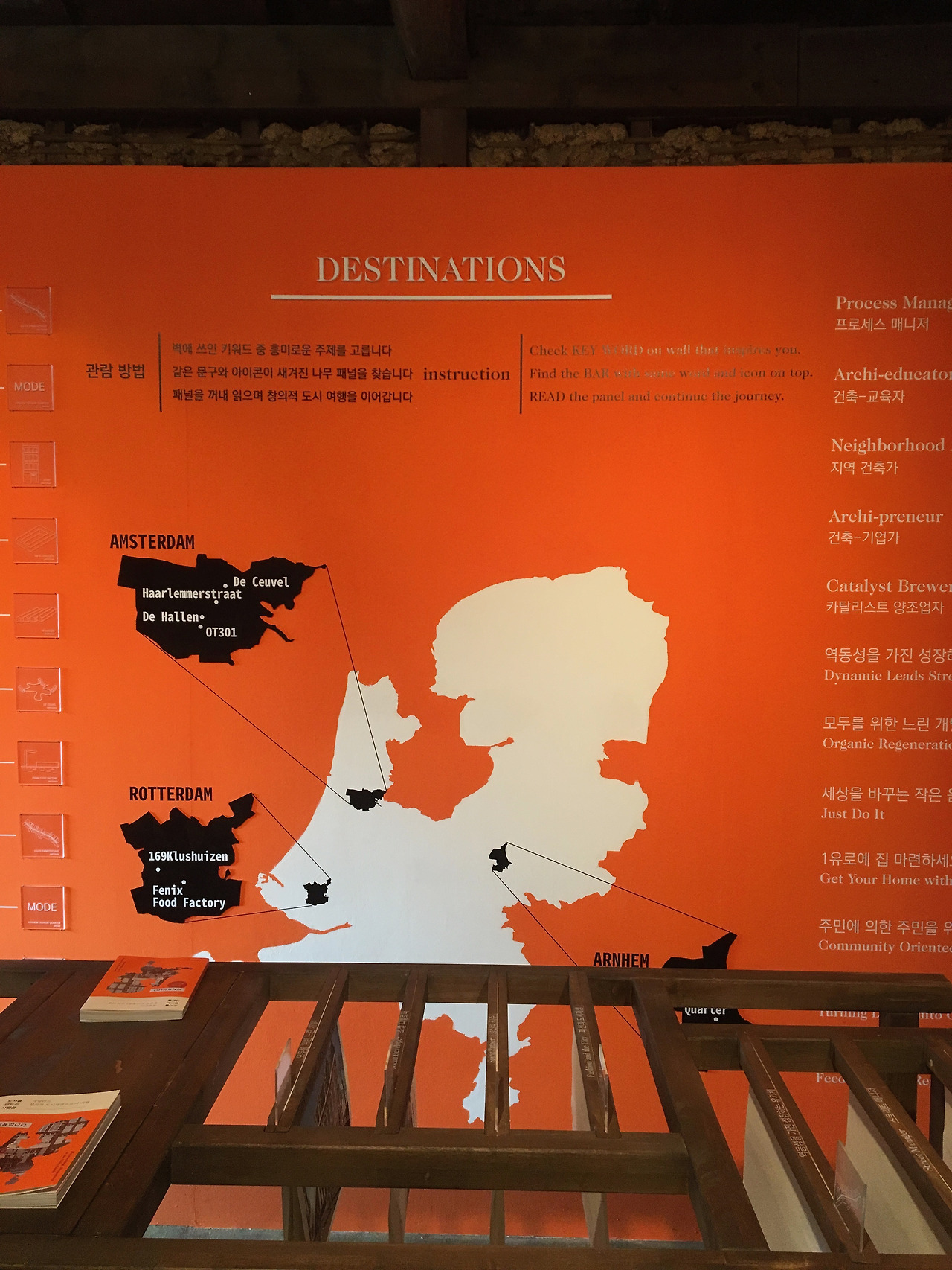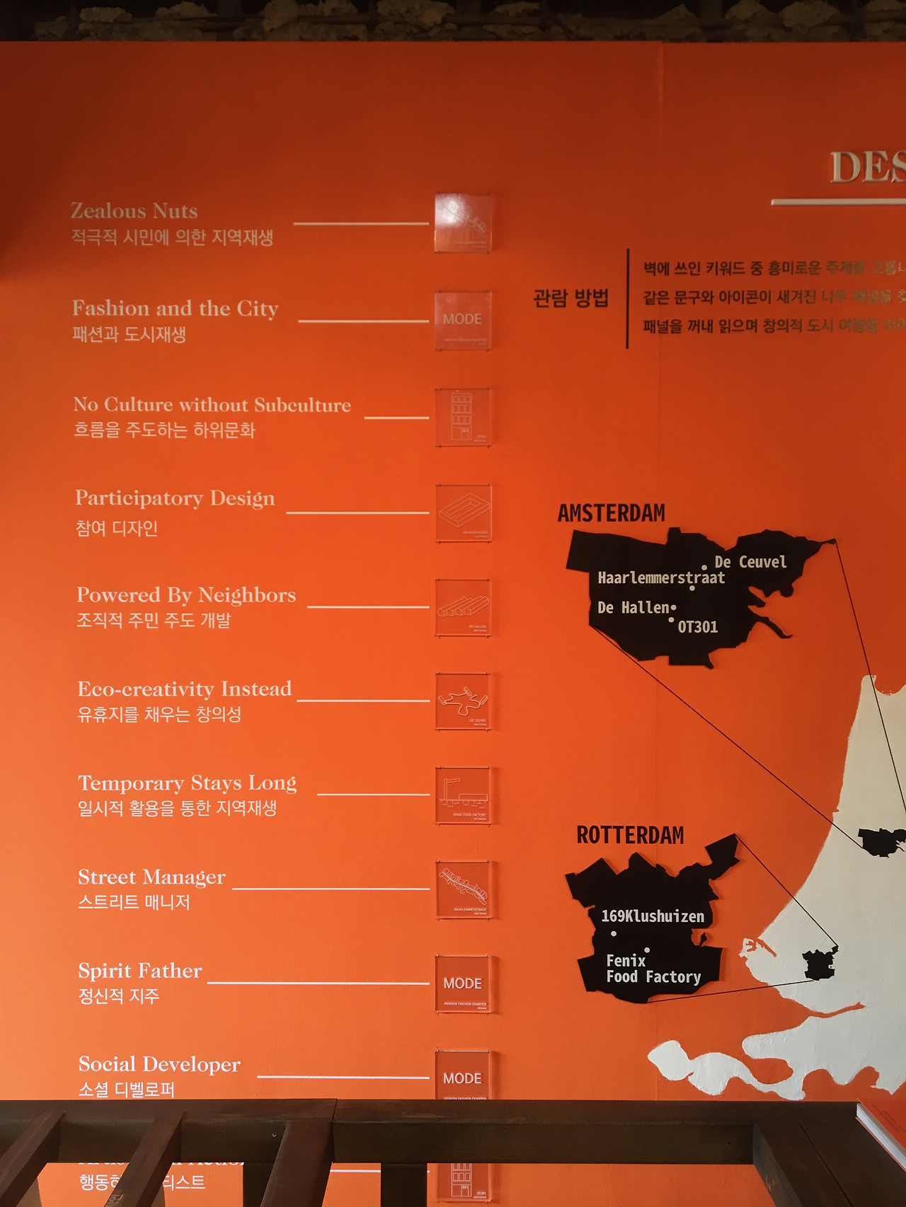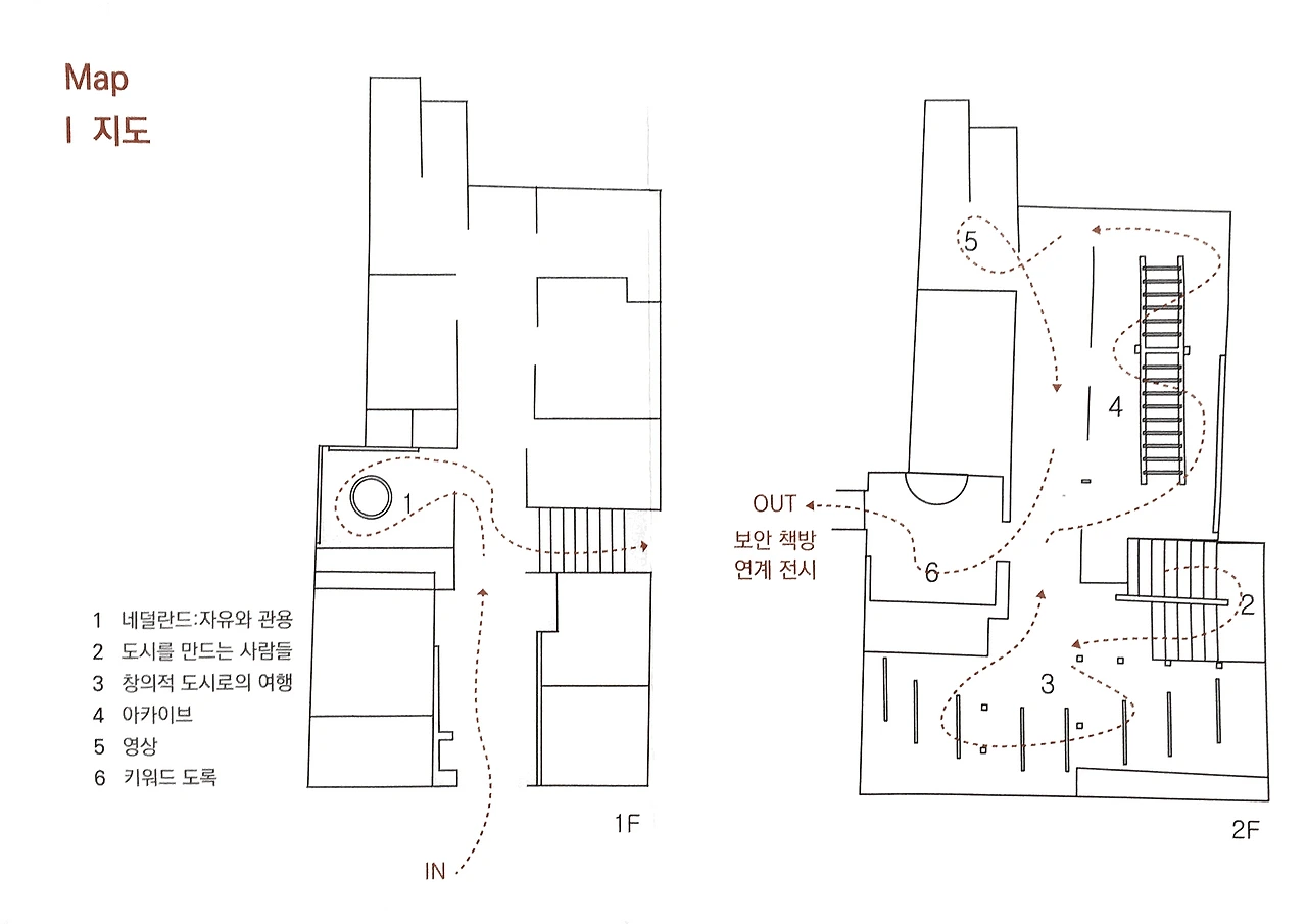 전시공간은 공간으로 크게 6개로 나뉘어 있다. 보안여관 구관 1층에서 전시에 대한 배경 이야기가 문지방에서 맞이하고 있고, (1) 왼쪽 방으로 들어가니 라운드테이블이 하나 놓여 있고, 벽면에는 네덜란드 사람들에 대한 이야기가 적혀 있다. 오래된 나무계단의 삐그덕 소리를 들으면 오르면, 2층 전체에서 메인 전시를 관람할 수 있다. (2) 계단참 벽면의 도시를 만드는 사람들 사진, (3) 네덜란드 창의적인 도시재생 사례지와 사람들에 대한 핵심 키워드 전시, (4) 핵심 키워드들에 대한 세부적인 스토리 열람, (5) 육성으로 듣는 사람들의 이야기, (6) 만난 이야기를 되새기는 공간까지 지나고 나면, 신관 2층 보안책방에 디스플레이된 (마치 미술관 굿즈샵처럼) 관련 도서들을 보며 마무리된다.