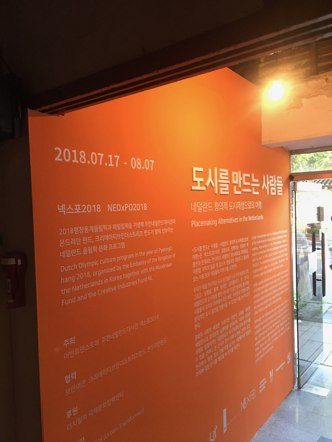 오후 7시가 조금 지나 많은 사람들이 모인 가운데 김정빈 교수의 인사말과 주한 네덜란드 대사 로디 엠브레흐츠(Lody Embrechts)씨의 축사와 함께 전시의 오픈을 알렸다. 주한 네덜란드 대사님이 오신 연유는 이것이다. 도시 연구작업이자 문화교류 차원으로 진행된 '도시를 만드는 사람들 - 네덜란드 창의적인 도시재생으로의 여행' 프로젝트는 주한 네덜란드 대사관에서 주최한 네덜란드 문화를 알리기 위한 NEDxPO 2018 프로그램 중 하나이다. 주한 네덜란드 대사관의 후원으로 진행되었다. 어반트랜스포머팀은 네덜란드 암스테르담, 로테르담, 아른헴 등지에서 다양한 도시재생 프로젝트를 오랜 시간 동안 지속적으로 진행해오고 있는 7개의 사례를 직접 취재했다. 기획하고 만들고 또 운영하고 있는 다양한 전문성을 가진 사람들을 만나 그들의 이야기를 듣고 돌아온 이야기를 엮은 전시이다.
