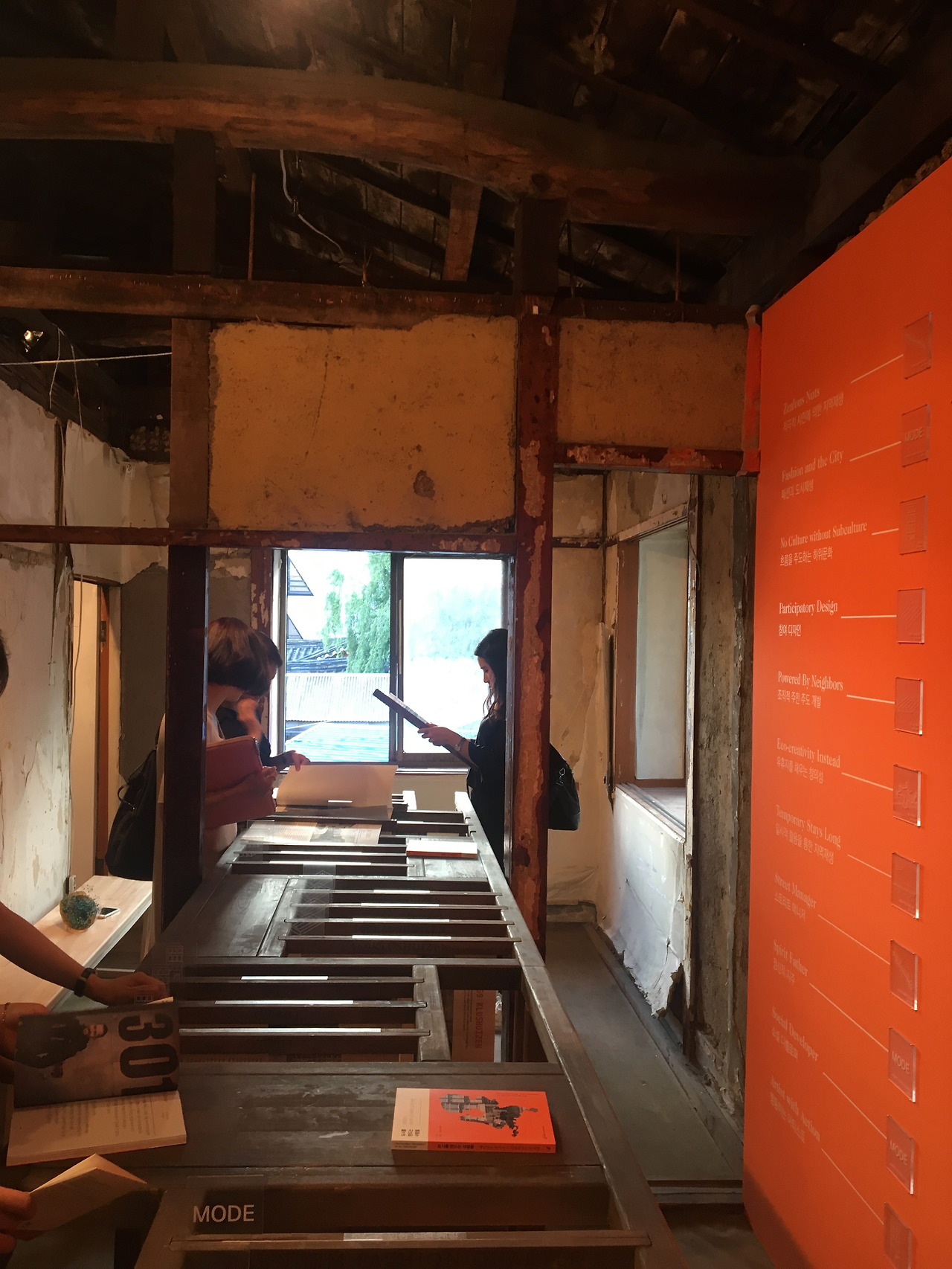 김정빈 교수님께 먼저 인사를 드리려 두리번거리다 보니 내빈분들과 이야기 나누고 계셨다. 조금 뒤에 인사드리기로 하고 돌아서는데, 때마침(방황하다가 다행히) 아는 얼굴을 만날 수 있었다. 2015년 협동조합 살림에서 주관한 오사카 답사 동행으로 알게 된 안나 대표님이셨다. 알고 보니 이번 전시 공간 기획과 디스플레이 설치 작업을 담당하셨다. 구관은 냉방설비가 전혀 안되어 있어 작업 내내 정말 고생하셨다. 낮에 품은 열기를 늦은 밤이 되어서도(심지어 새벽에도) 건물은 바깥으로 그 뜨거운 공기를 뿜어내지 못했다 한다. 1층은 시원하고 비교적 쾌적하다. (이 곳엔 주된 전시공간이 아니다.. ) 그러나 계단을 올라가면서부터 열기가 가득하다. 2층이 목조 박공지붕이고 층고가 높진 않지만 그래도 열이 빠질 여유공간은 있을 거라 생각했는데, 정말 한증막이었다. 더운 공기는 위로 올라간다는 사실을 또 한 번 직접 경험하는 순간이었다.