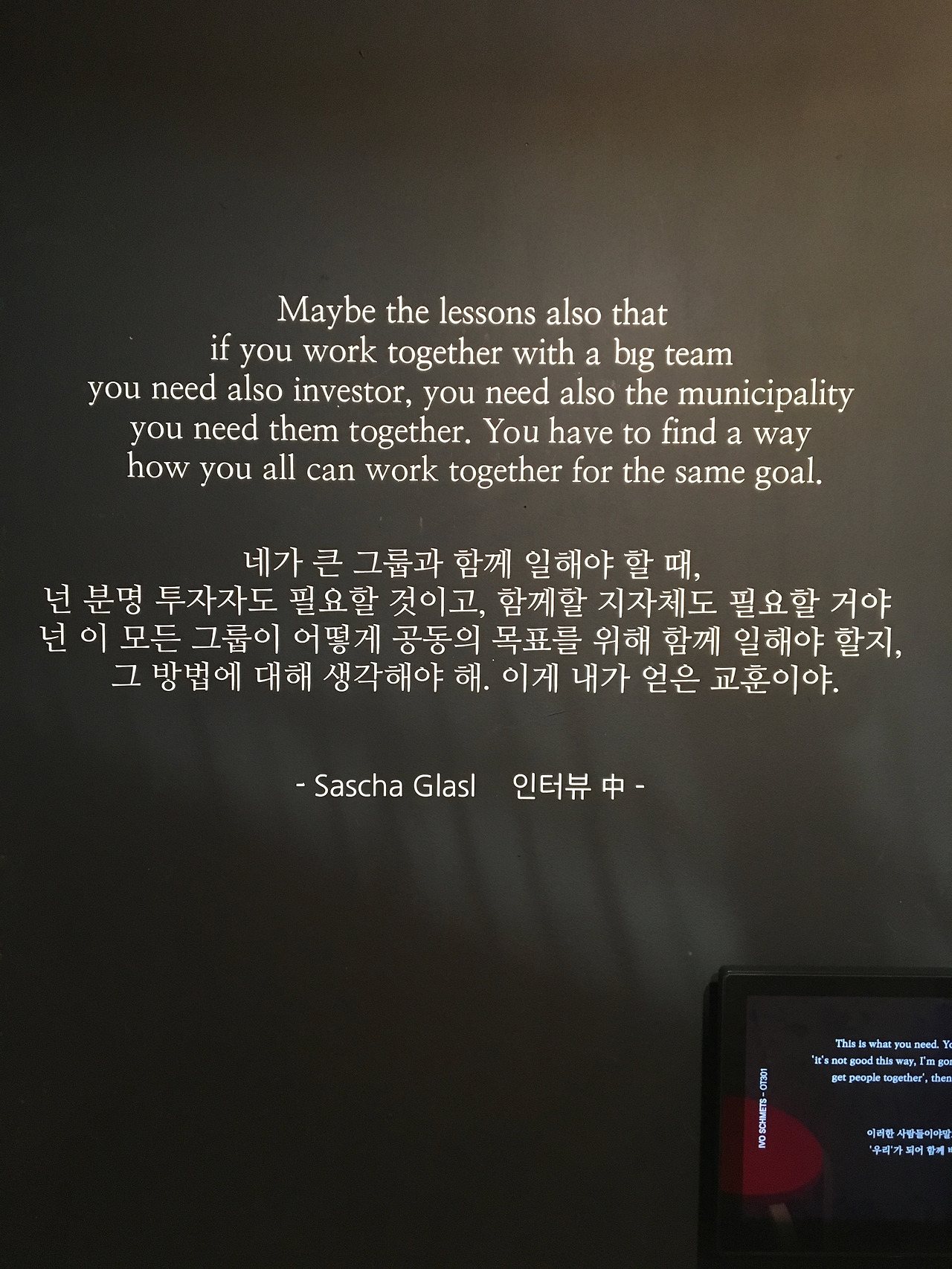한쪽 면에서는 인터뷰의 한 순간들로 여겨지는 도시를 만드는 사람들의 육성이 흘러나오고 있고, 또 다른 벽면에는 세 사람의 이야기가 문자로 새겨져 있었다.