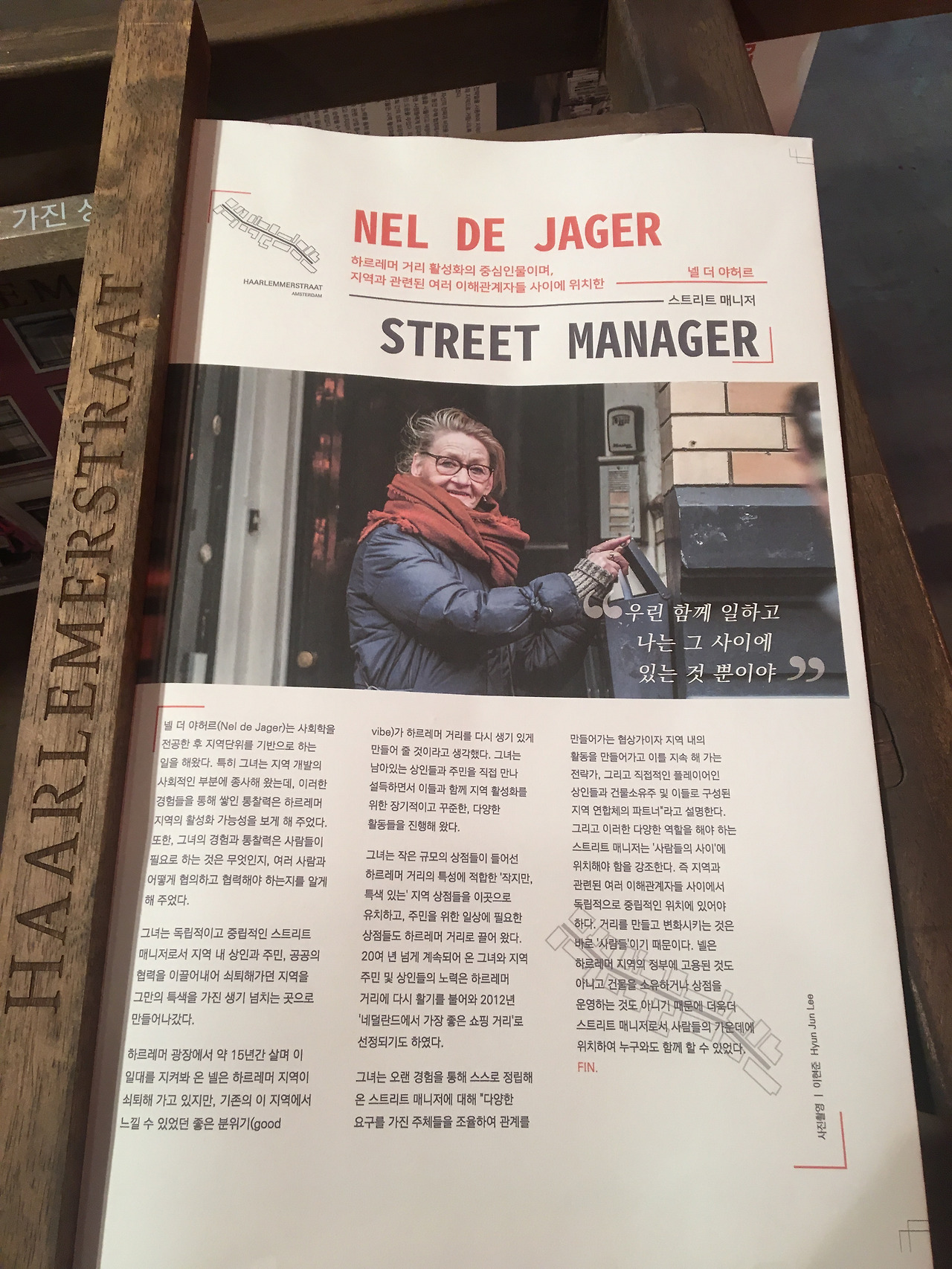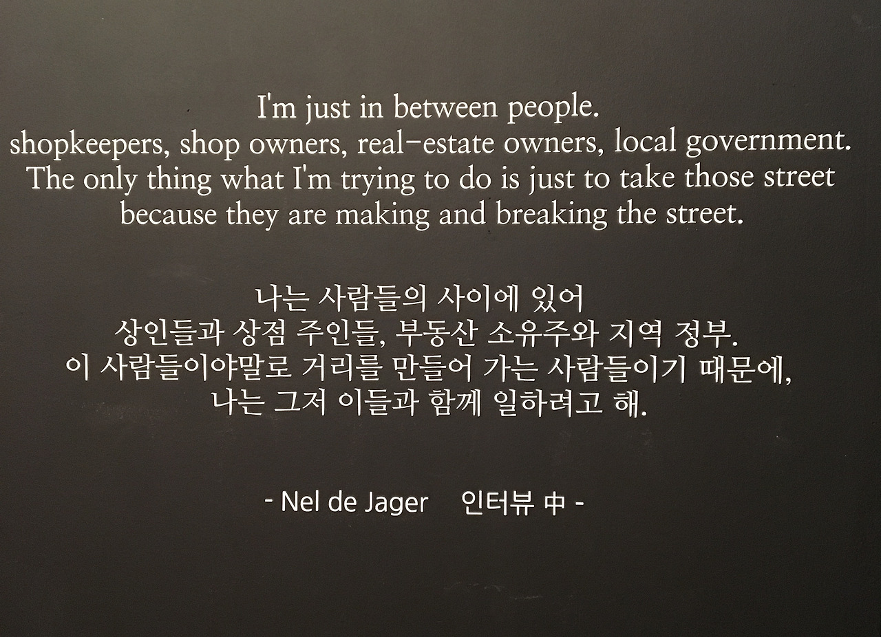 가장 눈에 띄는 사람은 '스트리트 매니저(Street Manager)' Nel de Jager(넬 더 야허르) 선생님이었다. TUT:Seoul 4번째 워크샵 때에 서울을 방문하셔서 그때 처음으로 이야기를 들었다. 그런데 일정이 맞지 않아 뒤늦게 도착한 탓에 이 분의 이야기를 실제로 듣지는 못했다.(소셜미디어를 통해서 이 분의 활동들을 지켜보고 있다.) 아쉬웠던 차에 본 전시와 책자를 통해 조금 더 자세히 다루어주고 있어 좋았다. 개인적으로는 성수동에서 일했던 모습과 가장 유사하다고 생각해 2016년 당시 더 궁금하기도 한 게 사실이다.