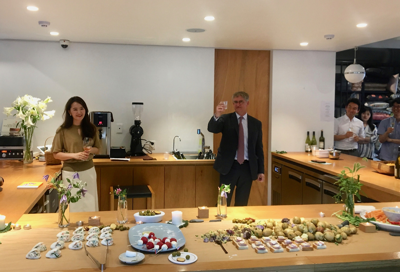 주한 네덜란드 대사 로디 엠브레흐츠(Lody Embrechts)씨께서 전시 개막을 알리는 건배사를 하고 계시다.