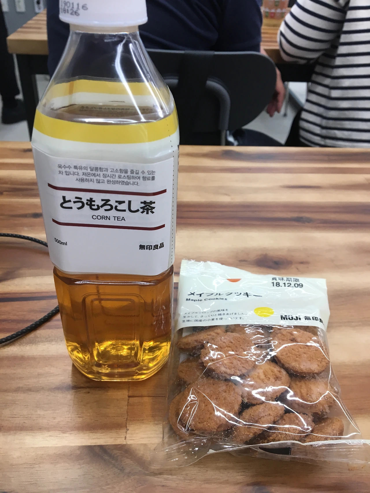 무인양품 코리아 측에서 준비해 주신 다과, 옥수수차와 메이플 쿠키