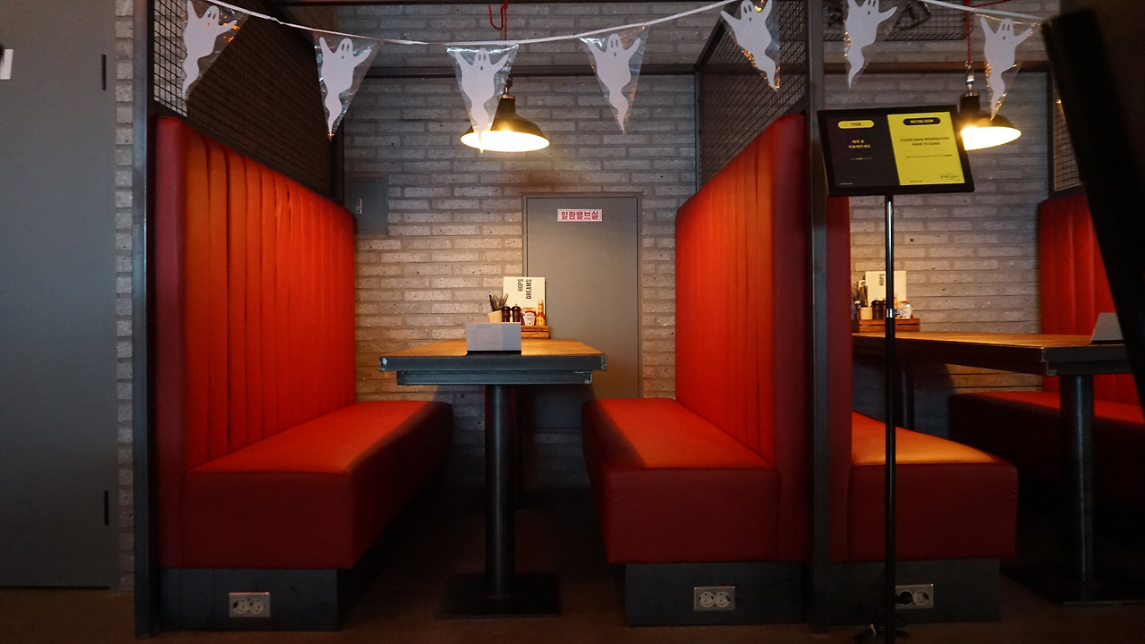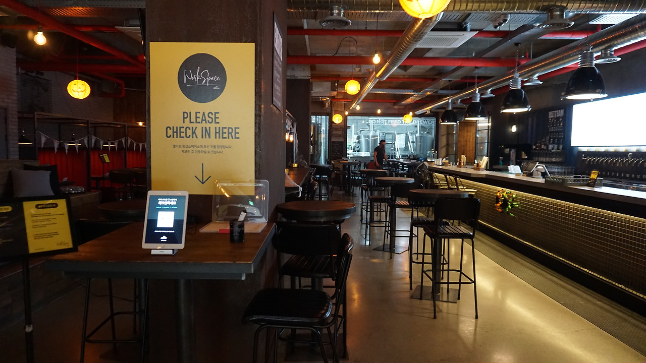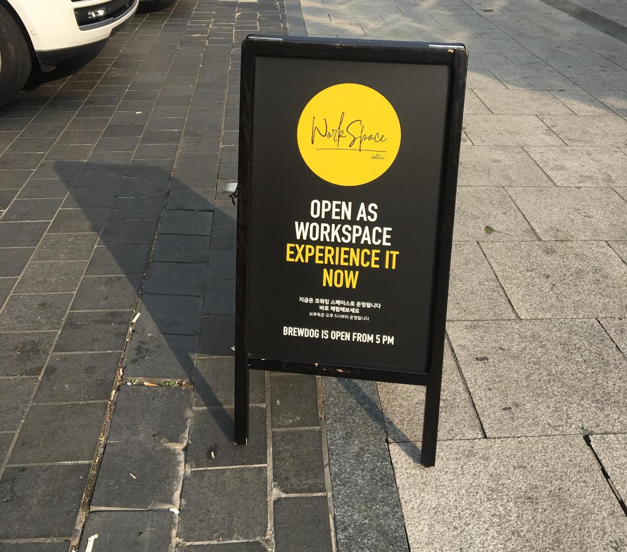 다시 브루독 이태원으로 돌아와 보자. 아침이 되면, 각각의 공간에는 다양한 안내판 등이 설치되며 공간의 성격이 새롭게 부여된다. 작은 변화이지만, 업무공간으로 사용하는 데에 큰 도움을 준다. 각 테이블에 놓여 있던 메뉴판, 소스통, 냅킨 등은 차례를 기다리고 워크스페이스임을 알려주는 친절한 안내 문구들이 도움을 주기 위해 대기하고 있다.