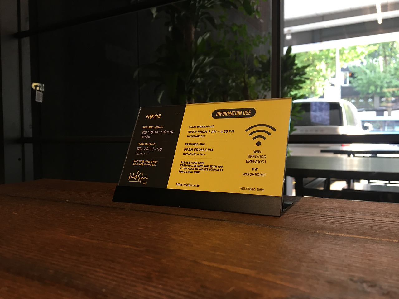 테이블마다 와이파이, 이용시간 등 워크스페이스에 대한 중요한 정보들이 배치되어 작은 변화만으로 펍은 워크스페이스가 된다.