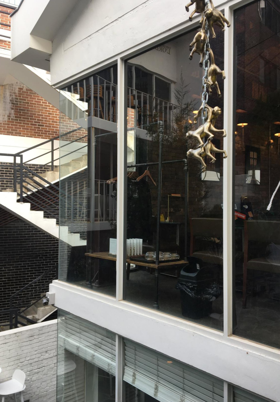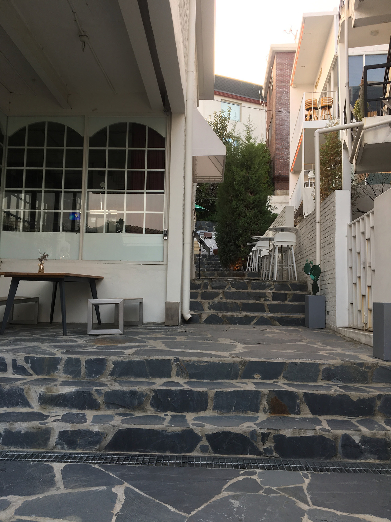 입구를 지나 마당으로 향해가는 계단, 왼쪽 건물이 Part A, 레스토랑 바이휴고와 라운지바 알곤퀸이 있는 곳이다.
