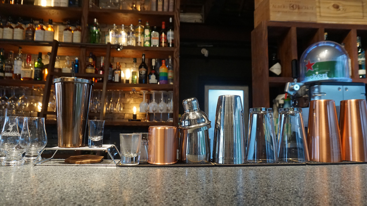바에 가지런히 정돈된 칵테일 잔, 쉐이커 등의 도구들