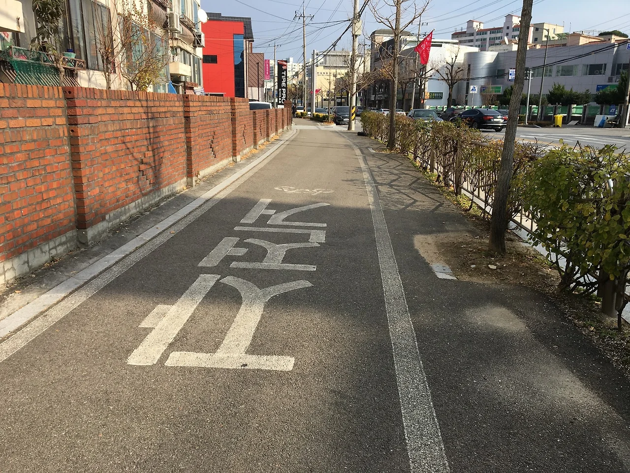강릉과 같은 지방도시에서 자동차는 필수라고 많은 사람들은 말한다. 대중교통인 시내버스는 평균 배차간격이 30분로 길기 때문에 버스 한 대를 지나 보내면 마냥 기다릴 수 밖에 없다. 그렇다고 매번 택시를 타고 이동하기에는 부담도 되고 거리상으로도 애매하다. 생활자전거(주1)를 이용하기에 적당한 규모의 시가지와 교외를 이루고 있는 강릉과 같은 지방 중소도시가 자전거 타기에 적합하지 않을까?라는 생각이 문득 들었다. 그러나 포남동 보행자길을 걷다가 발견한 자전거 도로 표시를 보고 깜짝 놀랐다. 보행자도로 ¾ 폭의 위치에 선을 긋고 대부분이 ‘자전거’라는 글자와 기호로 자전거 도로임을 표시하고 있었다.