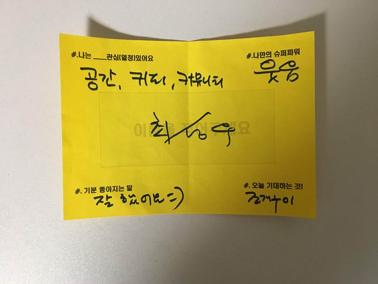 물흐르듯 술술술 흘러가는 멘트로 사람들을 움직인 공장공장 소연진님의 진행으로 매우 즐거운 대화가 오고갔다. 4개 질문을 스스로 먼저 답하고(작성하고) 사람들에게 자기 자신을 소개하는 방식으로 4~5명이 한 조가 되어 이야기를 나누었는데, 특히! 좋았던 질문은 "내가 가장 듣기 좋아하는 말"이었다. 한 사람이 자기소개를 마치면, 마지막에 다른 사람들이 그 말을 외쳐주는 것! 살짝 민망해 하면서도 매우 기분 좋았던 경험이었다.