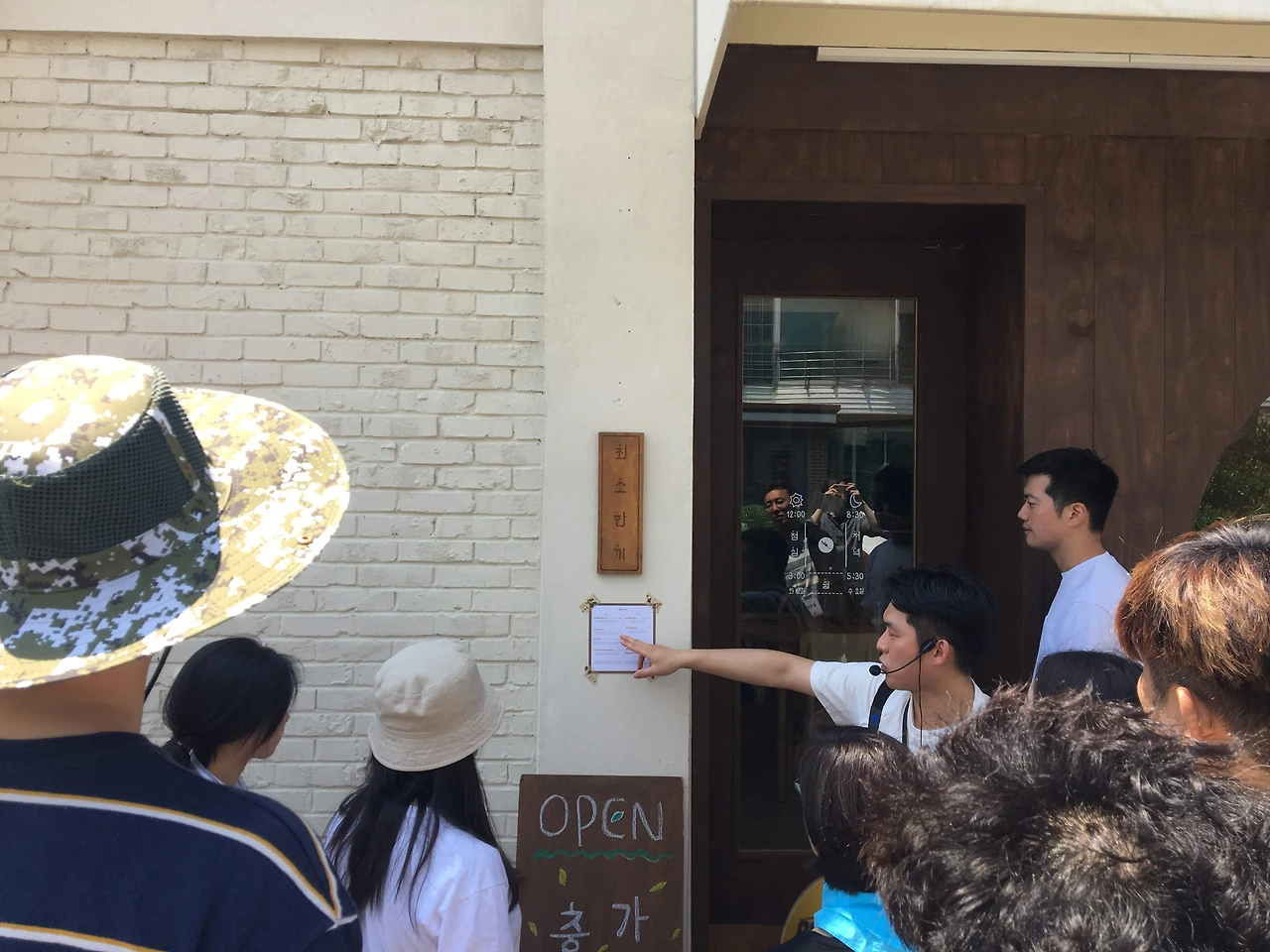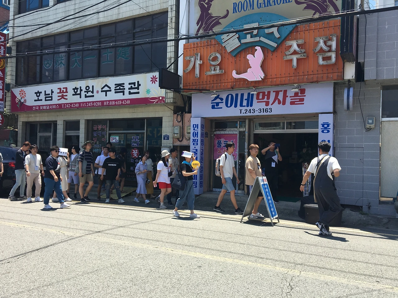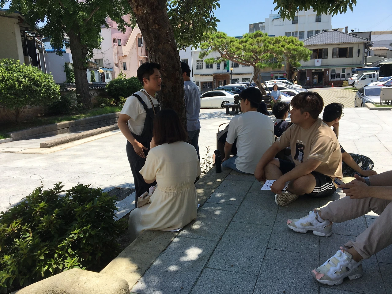 20명이 한 번에 이동하는 것인만큼 안전 문제가 특히 중요했다. 원도심 거리는 차도와 보도의 구분이 없는 곳이 많기 때문이다. 또한, 날씨도 더우니 안내하시는 공장공장이 목포에 대해 설명하고 안내하는 데에도 에너지가 많이 솟게 된다. 그래서 스트레칭에서 조나누기 게임으로 4~5명씩 조를 나눴다. 각 조에는 경찰(보통은 조장이라 부르겠지만.ㅎ)을 한 사람씩 두어 조원들을 살피도록 한다. 또한, 식사 시간에도 함께 하고, 휴식 타임에 시원한 커피와 아이스크림을 함께 나누는 등 투어 도중 많은 대화를 나눌 수 있었으리라.