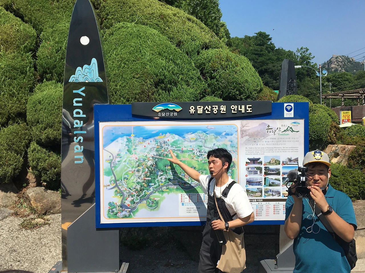 유달산 노적봉 앞 안내도에서 목포 지역에 대해 설명하고 있는 홍동우 대표 ⓒ 최성우