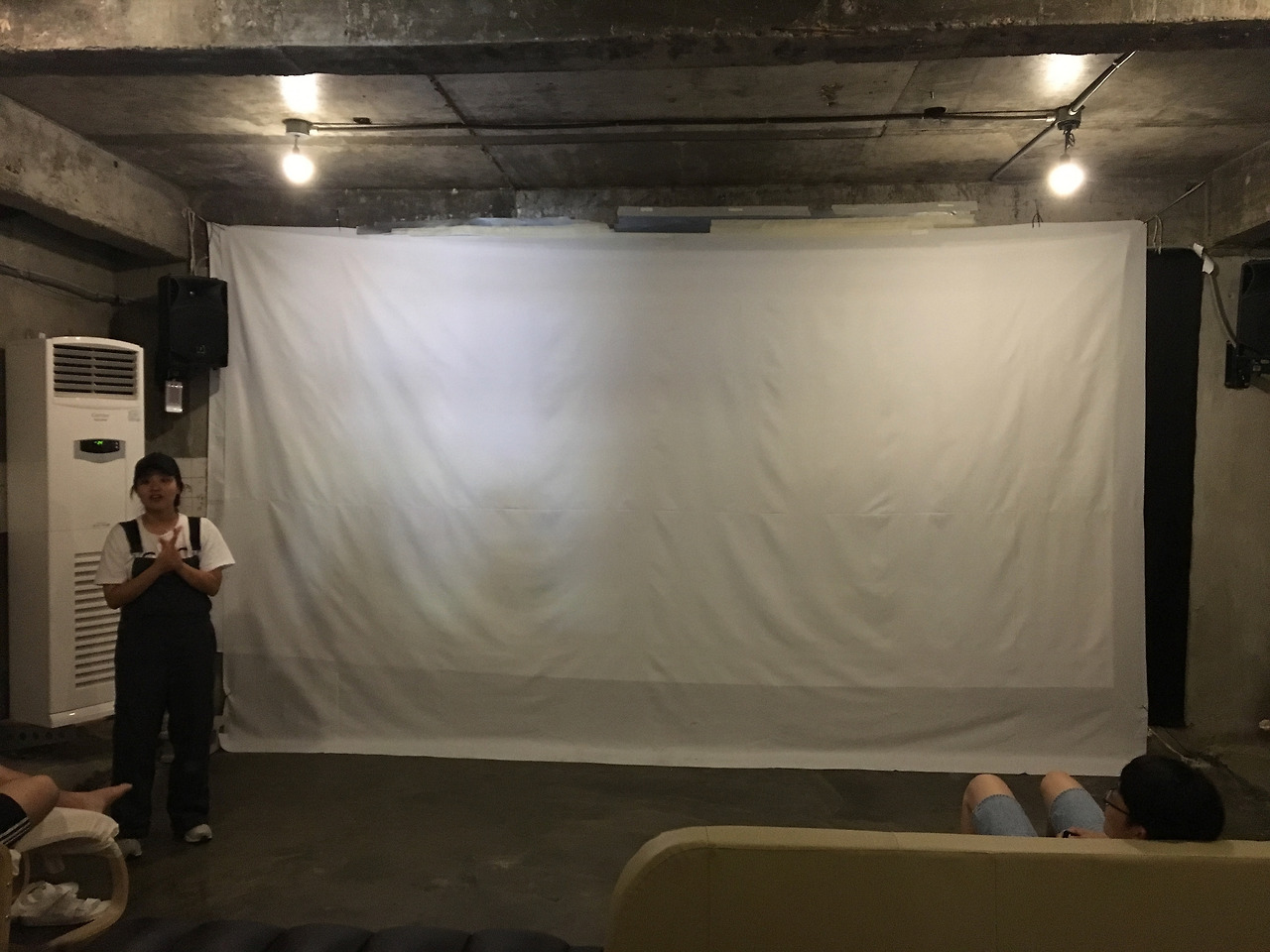 상영관 안으로 들어가면, 하얀 천으로 만든 스크린과 다양한 종류의 소파, 의자, 인원이 조금 많을 경우를 대비해 간이 의자도 준비되어 있다. 뒷 사람들에게도 충분히 시야가 확보되고 영화보다는 데에 조금의 부족함도 없었다.