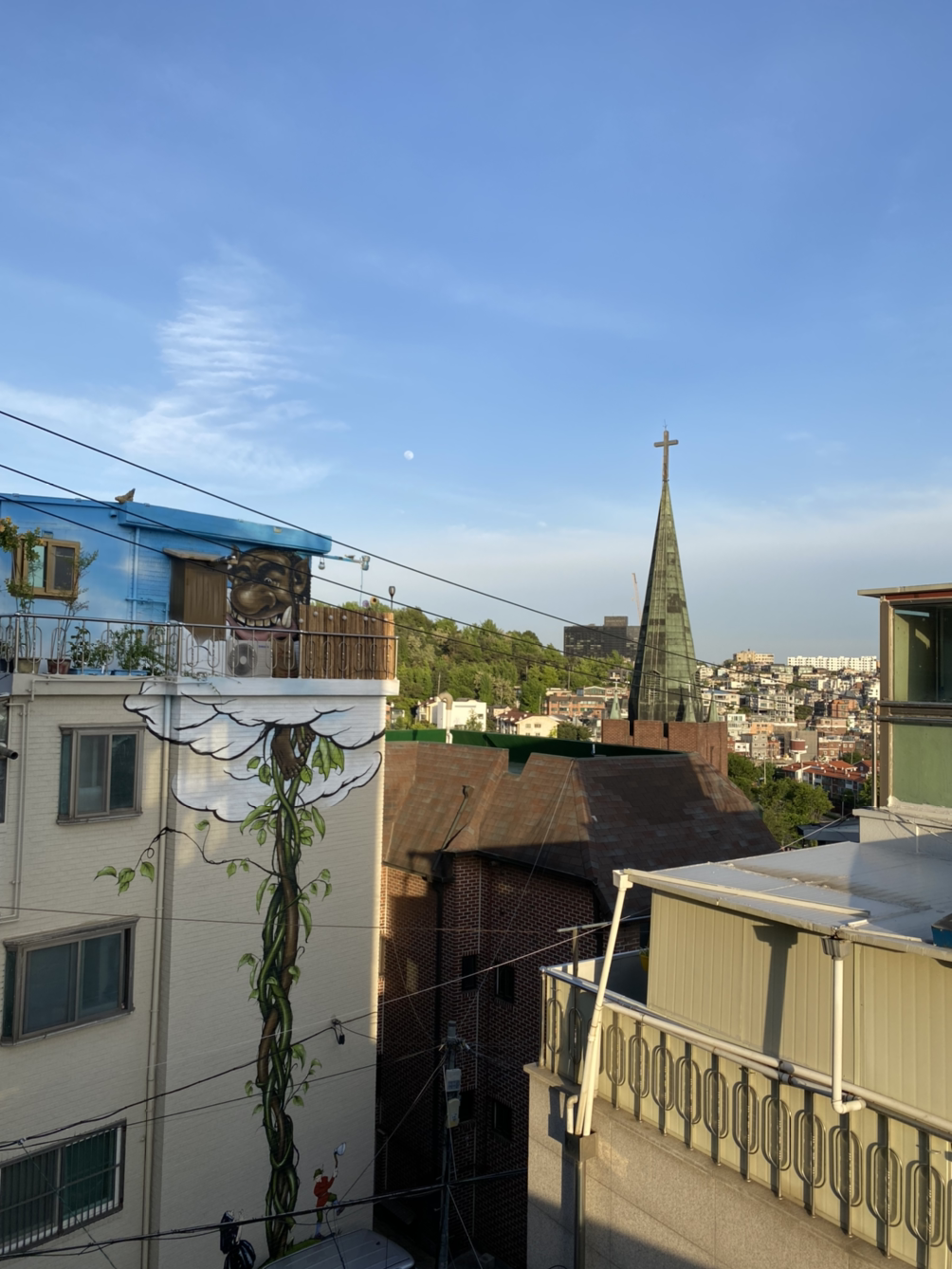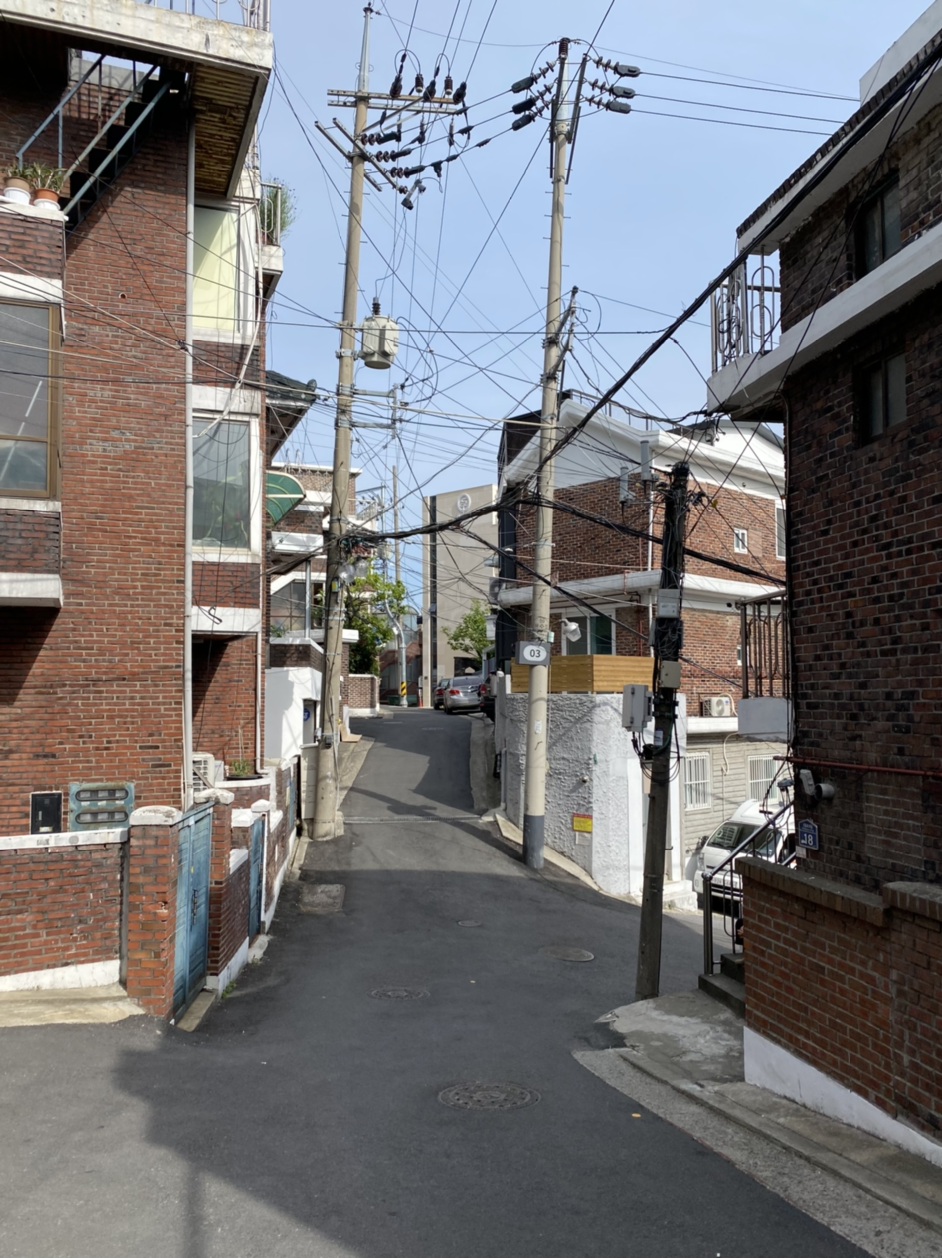 시원한 바람이 부는 해방촌 윗동네 빨간 돌담집들 사이로 신축 건물이 눈에 띈다.