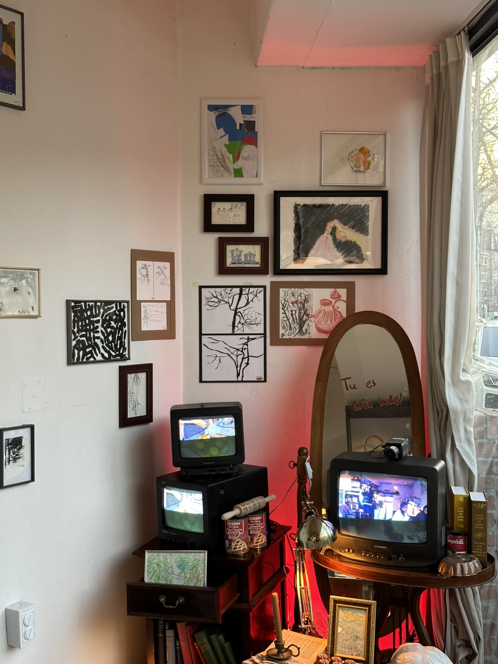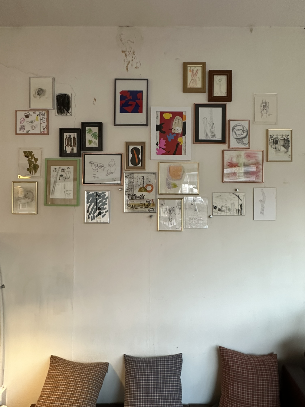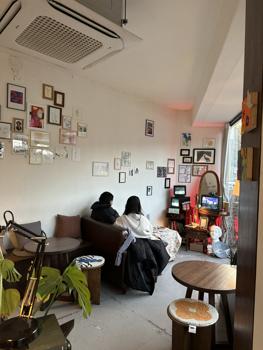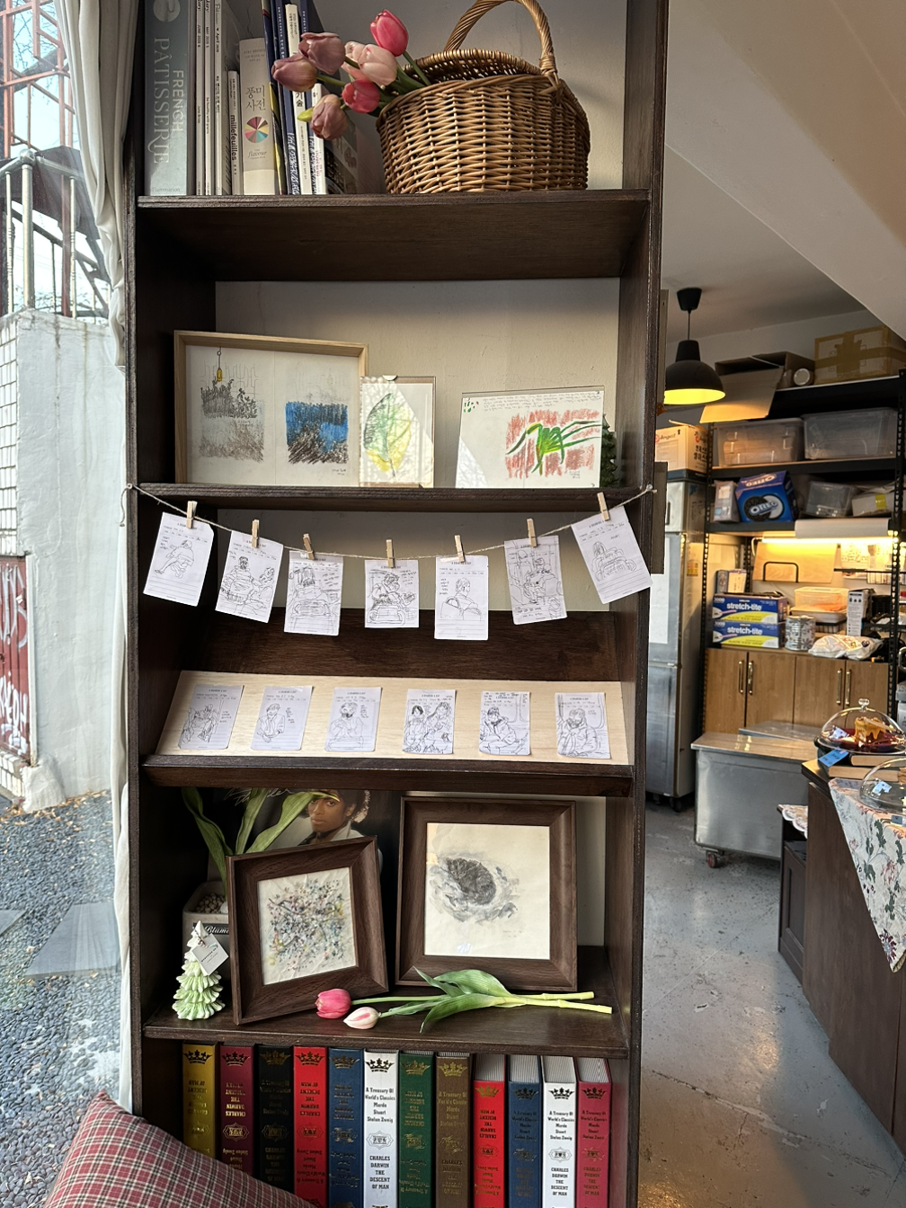 이번 전시는 카페의 일상에, 손님들의 시간에 그대로 스며들어 있는 것만 같아 좋았다. 입구에 들어섰을 때, 공간이 좁아서 불편하지 않을까 하는 생각도 스멀스멀 사라졌다. '자연스럽게 그리기'답달까! 공간에도 묻어나는 그들만의 색깔이 잘 드러난 전시였던 거 같다.