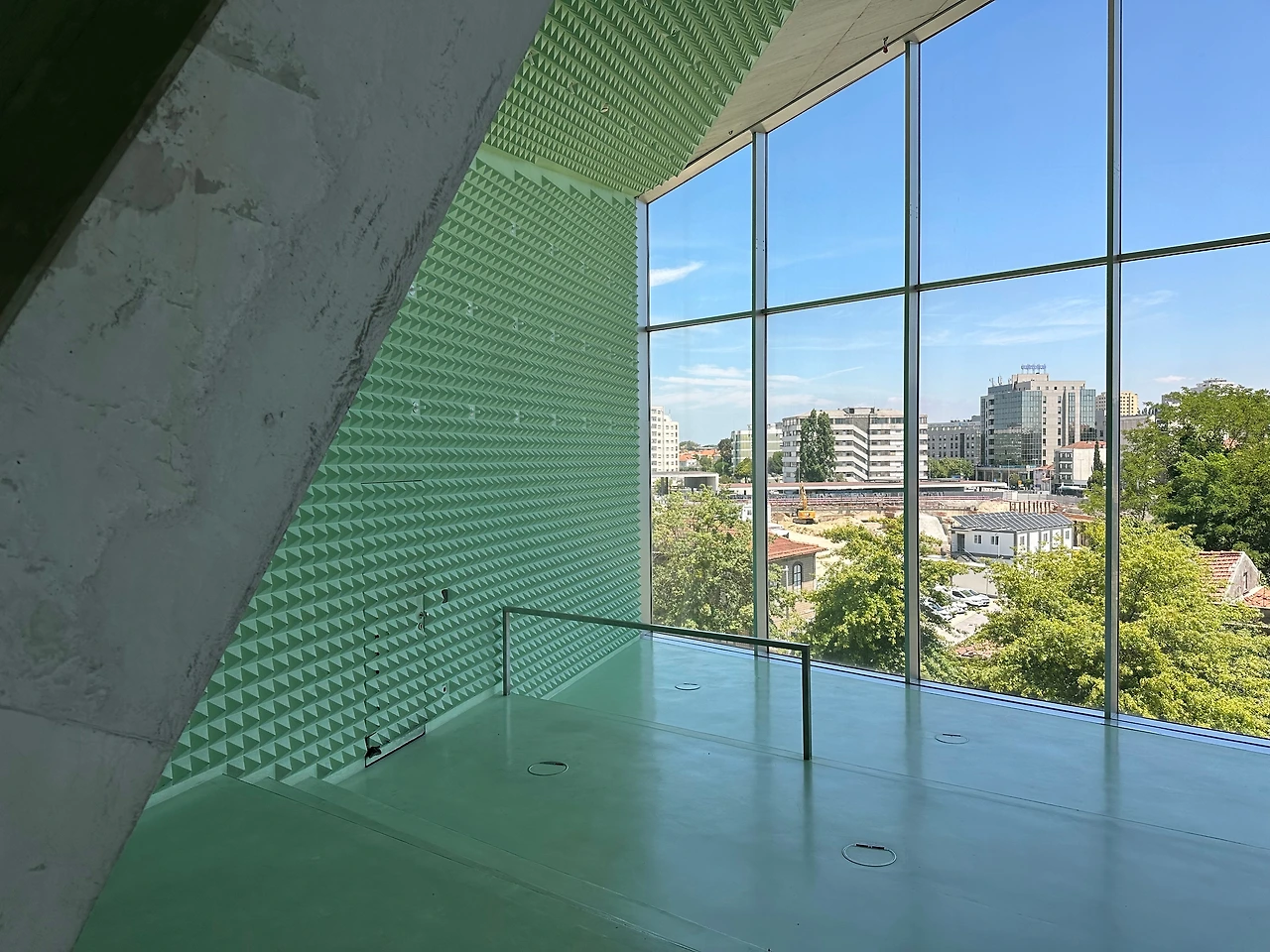 피라미드와 같은 모양을 한 민트색 벽이 천정과 두 면의 벽을 둘러싸고 있고, 도시와 대공연장 간의 시각적 연결은 이곳 역시 유효하다. 이곳의 특징은 물결치는 유리창 일부가 열리다는 점이다. 리허설 시간에 소리로도 연결이 이어지는 유일한 공간이다.