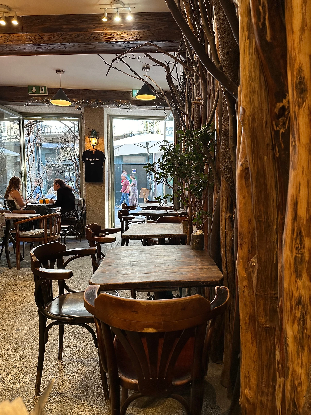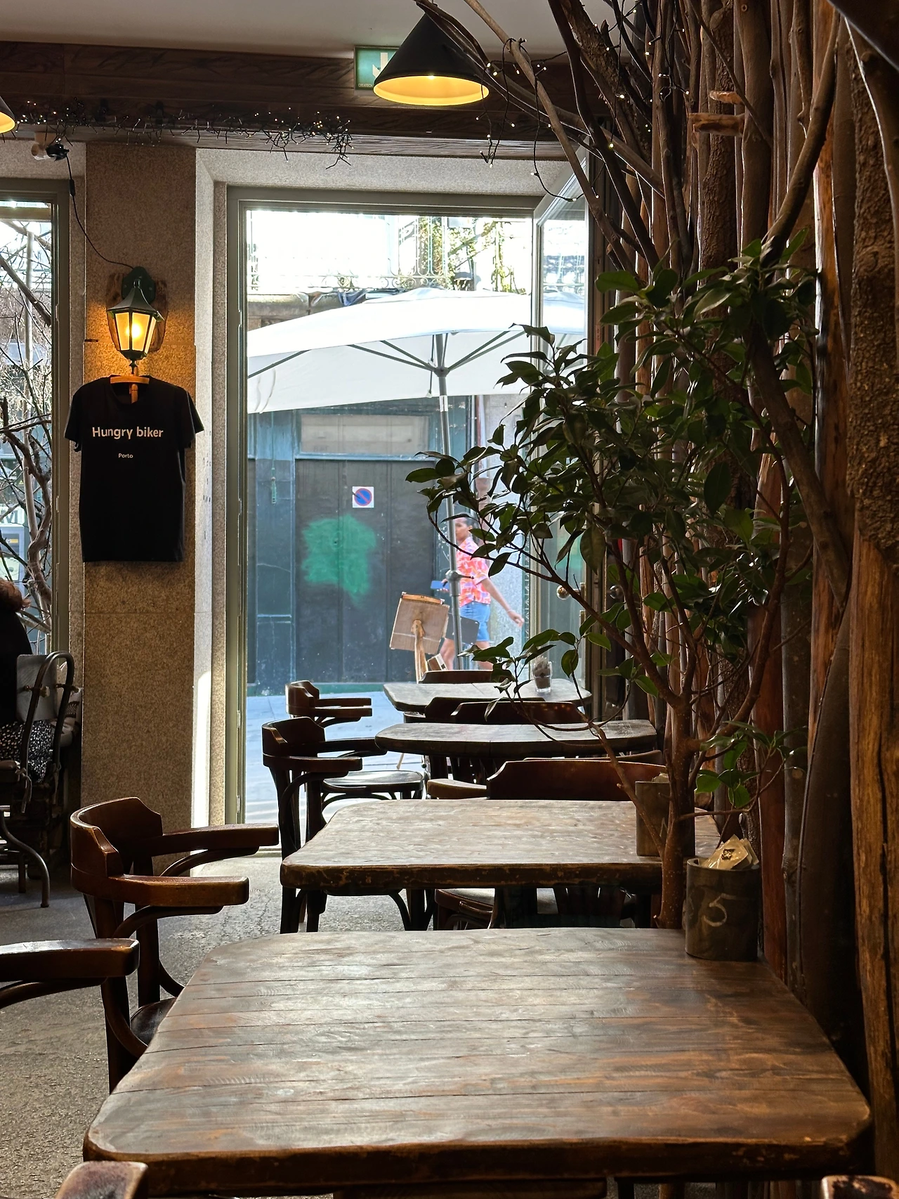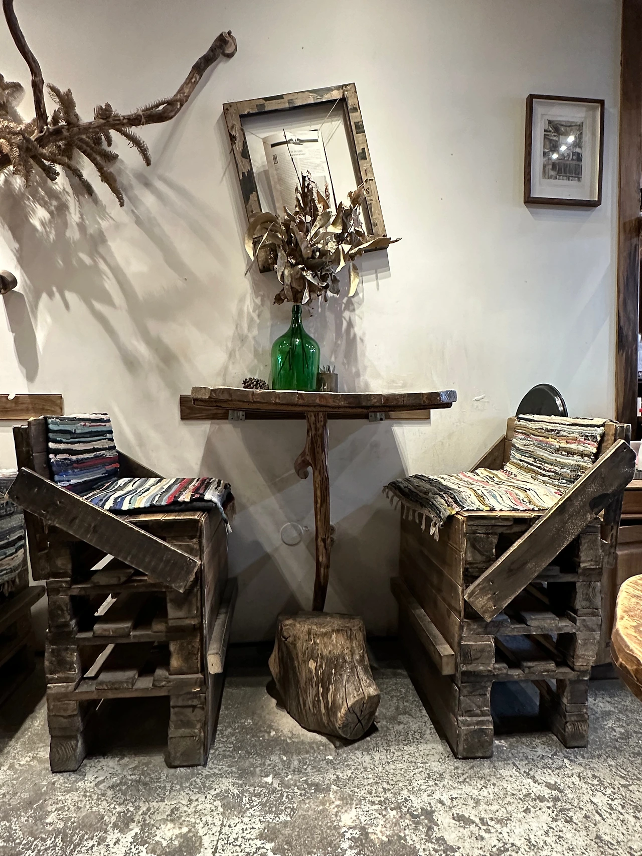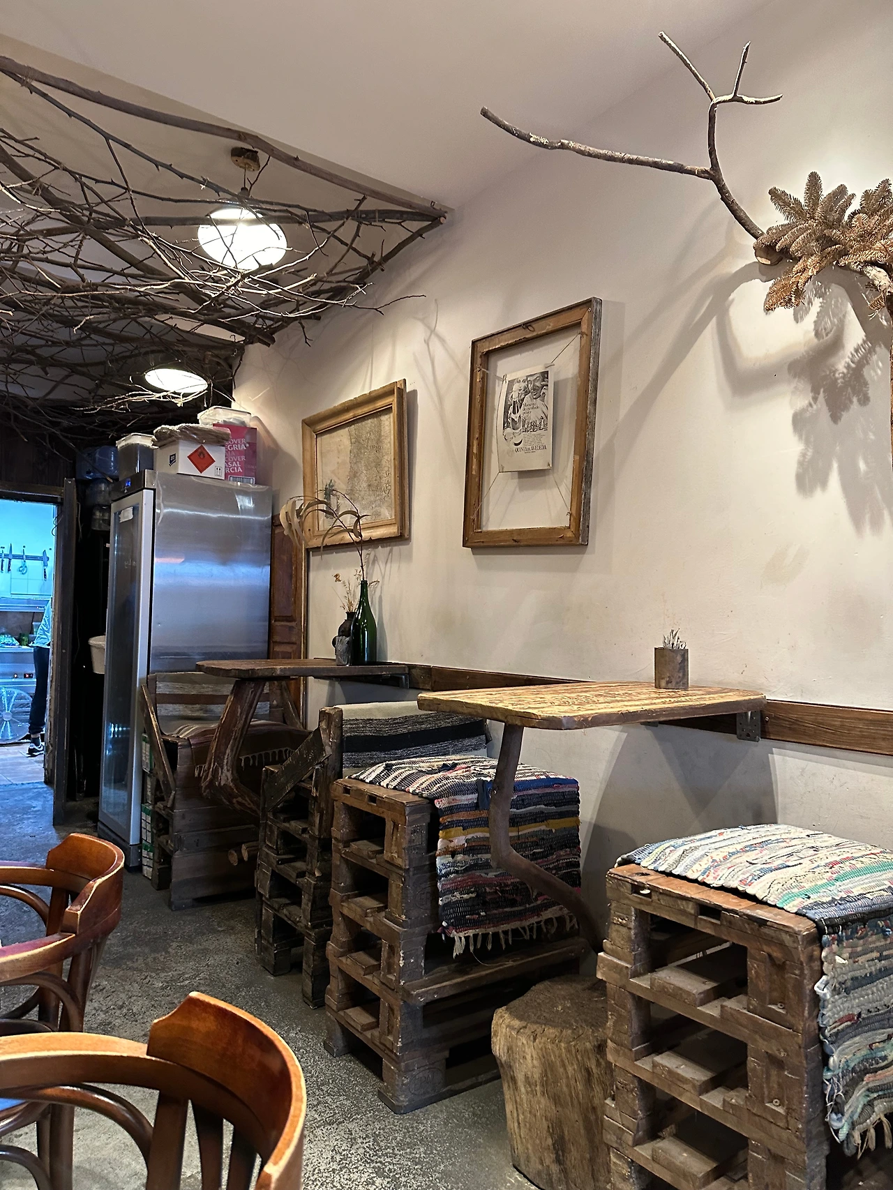 '일요일이니까 브런치!'라는 단순한 발상에서 찾아낸 브런치 카페는 숙소에서 2분 거리에 있었다. 숙소에서 준비해 둔 캡슐로 에스프레소 한 잔을 마시고 잠을 깨우고 챙겨서 아침 공기를 마시러 나갔다. 바깥 테이블은 이미 다 채워져 있었다. 골목 사이로 햇살이 내려 쬐기 시작하는 시간, 적당히 선선한 공기의 아침은 한낮에 야외에서 식사하는 것과는 또 다른 낭만이 있어 보였다. 나는 실내로 들어갔다. 반전이 있었다. 산장과 같은 분위기, 빈티지스러운 목재로 카운터를 꾸몄고, 나뭇가지를 엮어 천장과 벽을 얼기설기 장식했다. 하이라이트는 팔레트를 잘라 쌓아 만든 의자와 테이블이다. '헝그리 바이커Hungry Biker'가 운영하는 곳이라 적어둔 것처럼 그들만의 개성이 묻어나는 공간이다.