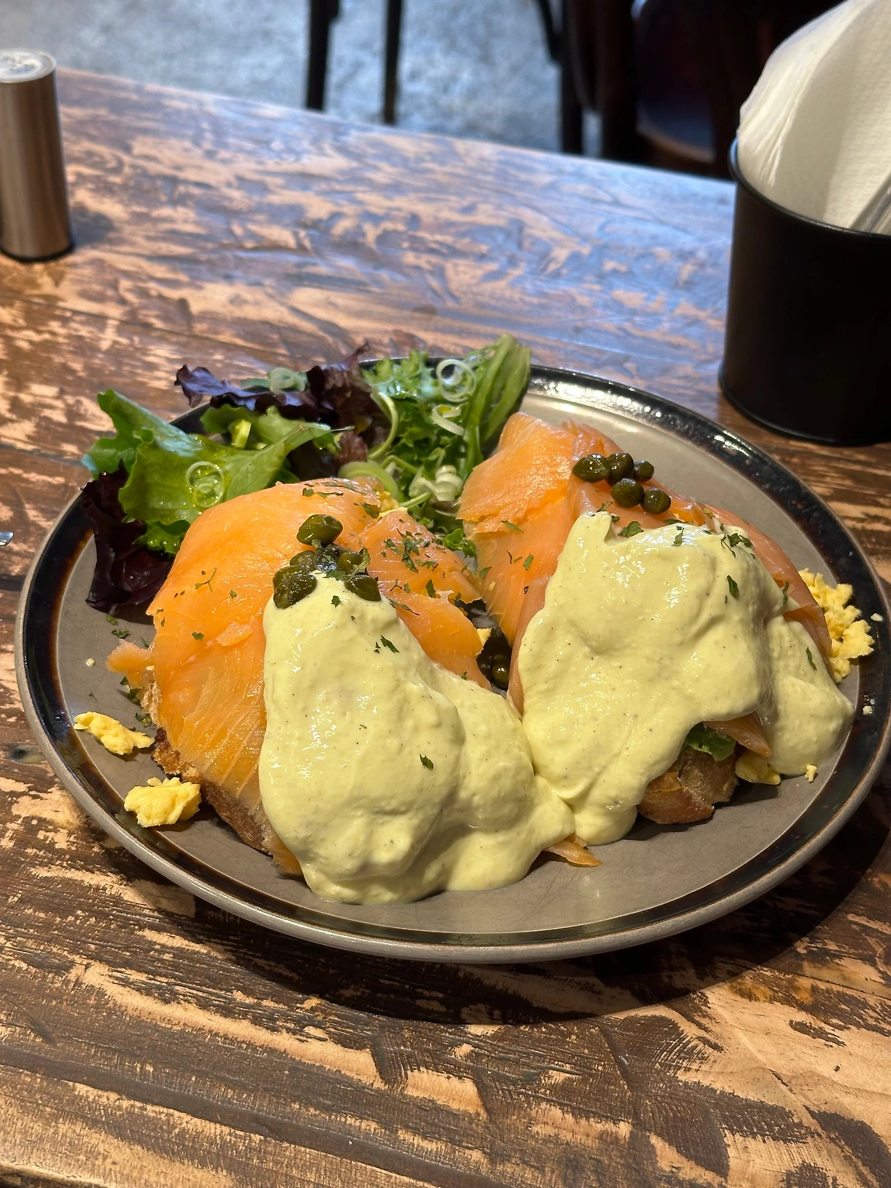 라떼와 연어 토스트를 주문했다. 연어 아래로 아보카도와 스크램블 에그가 숨겨져 있다. 투박해 보이기도 하는 비주얼이지만, 맛이 없을 수 없는 조합이다. 아침을 사 먹으니 이렇게 여유롭다.