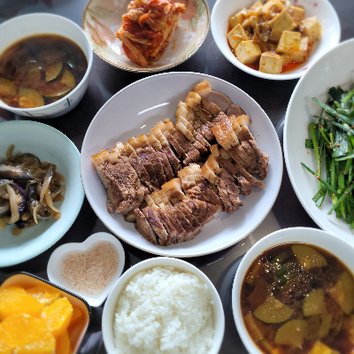 밥과 반찬(앞다리 수육 등),