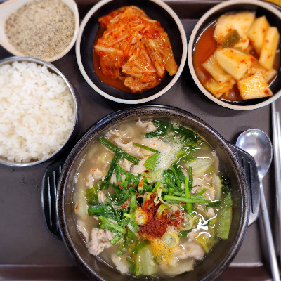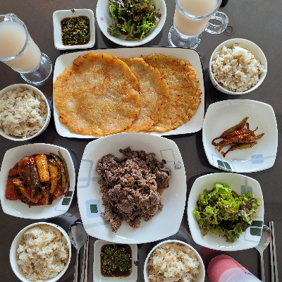 *감자전, 불고기, 상추겉절이, 고추장아찌, 오이부추김치, 고추 간장소스, 식혜