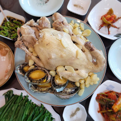 백숙(with 전복, 부추, 통마늘), 오이부추김치, 고추장아찌 무침, 고추 간장소스, 소금+후추, 참외, 하겐다즈 피스타치오&크림