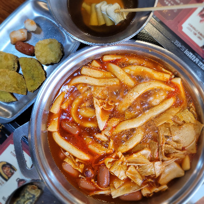 떡볶이, 튀김, 어묵 꼬치 1개, 환타 파인애플맛