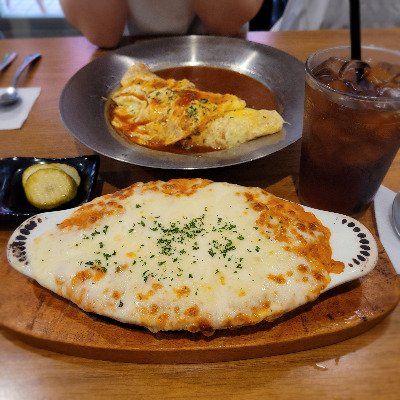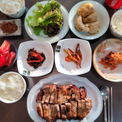 *목살 바비큐, 볶음 김치, 고추장아찌 무침, 무말랭이 고들빼기, 상추, 쌈장, 토마토, 만두, 콩물