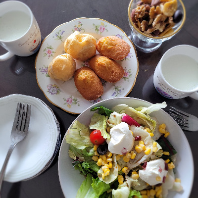 슈크림 빵, 마들렌, 리코타 발사믹 샐러드, 믹스넛, 우유+요거트