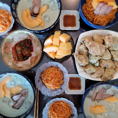 콩국수, 비빔국수, 오이부추김치, 만두, 멜론