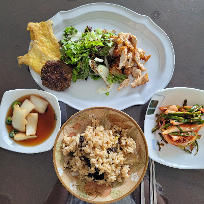 *소갈비 볶음밥, 홀그레인 머스터드 치킨 샐러드, 오징어초무침, 양파 고추절임, 새송이버섯전, 고기완자