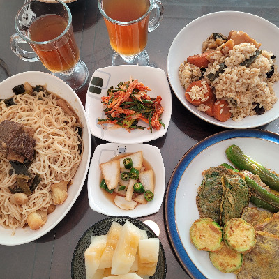 *소갈비 볶음밥, 소갈비 국수, 오징어초무침, 모둠전, 양파 고추절임, 멜론, 동동주