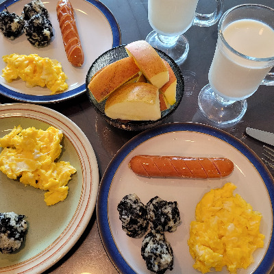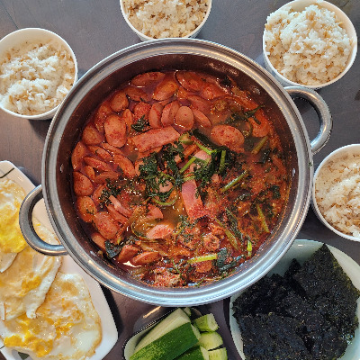 밥과 반찬(부대찌개 등), 요구르트, 끌레도르 1/3