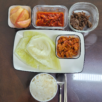 *양배추 쌈, 돼지고기 고추장 볶음, 불고기, 도라지 무침, 복숭아