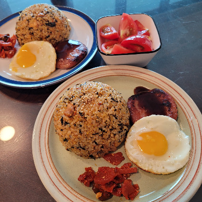 떡갈비, 플레이크를 넣은 닭갈비 볶음밥, 계란프라이, 무장아찌, 절인 토마토
