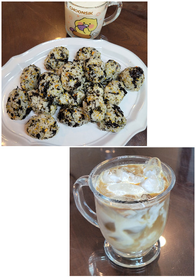 김자반+해물 플레이크 주먹밥, 우유+요거트, 요거트 라테