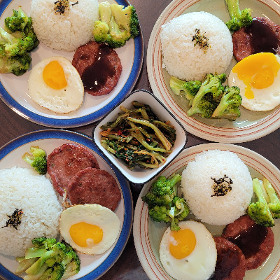 *떡갈비, 계란프라이, 브로콜리, 해물 플레이크
