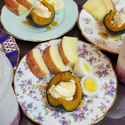 *단호박찜+리코타치즈+꿀, 삶은 계란, 사과