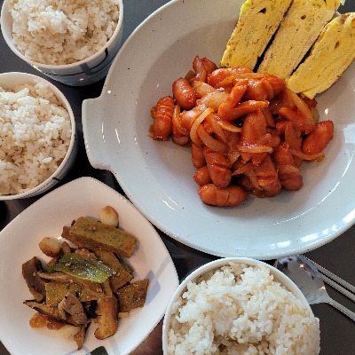 *소시지 양파 듬뿍 볶음, 계란말이, 표고버섯 어묵볶음(표고버섯, 어묵, 통마늘, 대파), 김