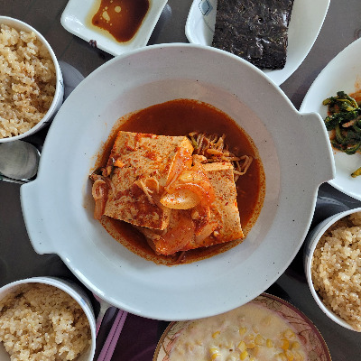두부 콩나물 조림, 김, 간장, 콘치즈, 열무김치