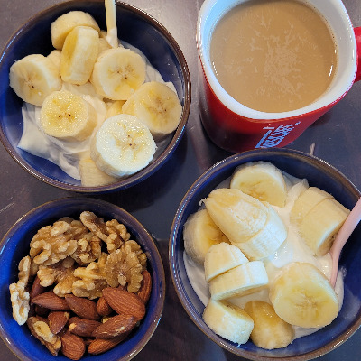 간다, 단탄지 아침: 그릭 요거트+바나나, 호두, 아몬드, 화이트 아메리카노