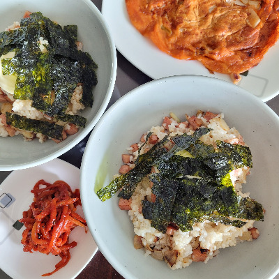 간다, 단탄지 점심: 스팸 마요 밥(스팸, 양파, 마요네즈, 김), 오징어 김치전, 무생채