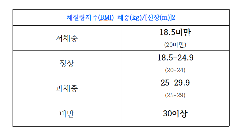 체질량지수(BMI)는 체중을 키의 제곱으로 나눈 체질량지수이다. 간편하게 저체중, 정상체중, 비만도를 가늠하는 방법으로 많이 쓰인다.