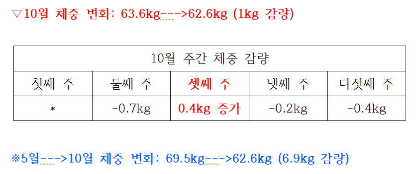 10월 다섯째 주(10월 27일~10월 31일) 체중 변화: